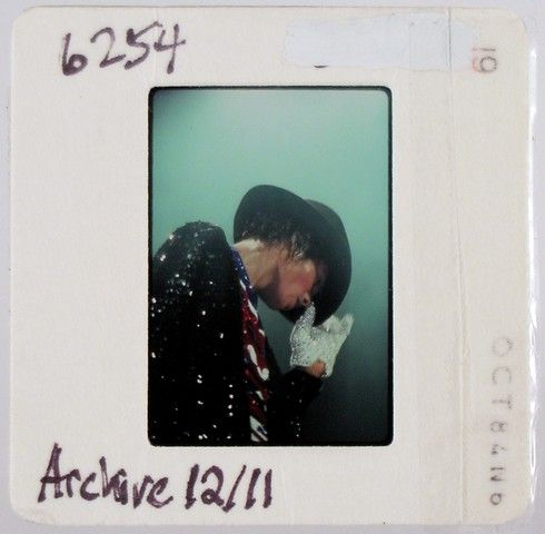 All the great iconic symbols of Michael Jackson, including his glove, fedora, and glittering jacket during the Victory Tour circa 1984. These photos were commission by Joe Jackson, father, founder and early manager of his children, Michael Jackson and the Jackson 5. He hired the top music concert photographers of the day to take pictures of Michael Jackson and the Jackson Five (both in individual performances and as a group), while they were on tour, and during personal appearances, as well as at family get-together's. The purchase of this photo includes the original transparency, and includes a full copyright release for your own personal unlimited reproduction printing and selling to the winning bidder. They are the original 35 millimeter film used to take the picture, and are professionally mounted in “slide” paper for protection. The original film sprockets can be seen when the paper is removed. The color reversal film was used by these photographers, because, as is standard in the industry, this film stock creates more detailed images especially in Concert and low-light situations, and in many ways is actually superior to color negative film stock for reproduction purposes. Bidders are advised that all proceeds from sales and delivery of the purchased items will be held by Premiere Props in escrow pending resolution of these claims unless the successful bidders assume the risk.
