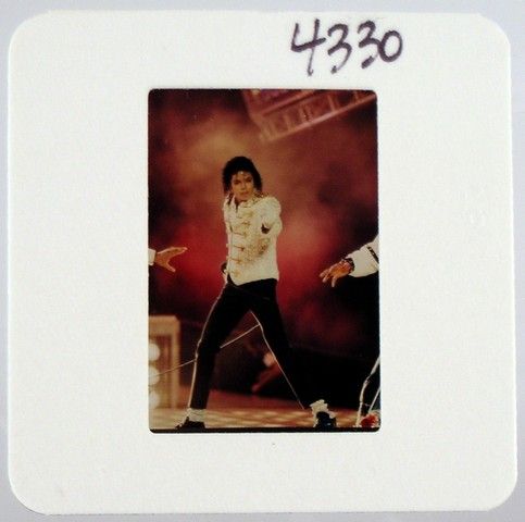 Michael Jackson a second away from beginning one of his famous dance sequences during his Victory Tour circa 1984. These photos were commission by Joe Jackson, father, founder and early manager of his children, Michael Jackson and the Jackson 5. He hired the top music concert photographers of the day to take pictures of Michael Jackson and the Jackson Five (both in individual performances and as a group), while they were on tour, and during personal appearances, as well as at family get-together's. The purchase of this photo includes the original transparency, and includes a full copyright release for your own personal unlimited reproduction printing and selling to the winning bidder. They are the original 35 millimeter film used to take the picture, and are professionally mounted in “slide” paper for protection. The original film sprockets can be seen when the paper is removed. The color reversal film was used by these photographers, because, as is standard in the industry, this film stock creates more detailed images especially in Concert and low-light situations, and in many ways is actually superior to color negative film stock for reproduction purposes. Bidders are advised that all proceeds from sales and delivery of the purchased items will be held by Premiere Props in escrow pending resolution of these claims unless the successful bidders assume the risk.