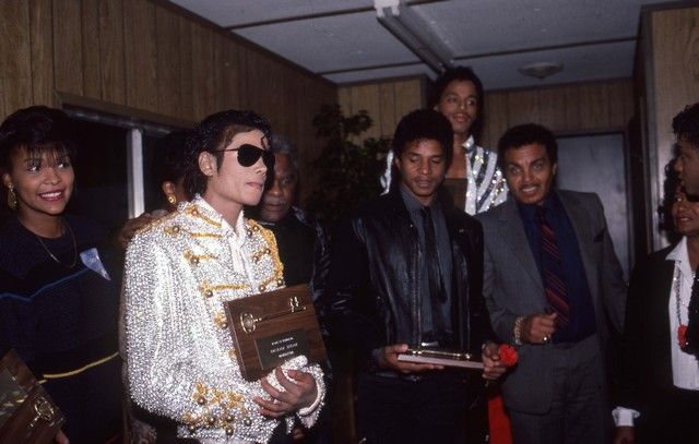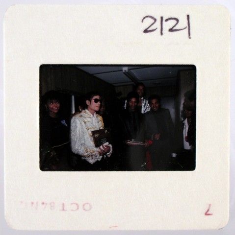 Michael Jackson flanked with brothers and family as they receive an award during their Victory Tour circa 1984. These photos were commission by Joe Jackson, father, founder and early manager of his children, Michael Jackson and the Jackson 5. He hired the top music concert photographers of the day to take pictures of Michael Jackson and the Jackson Five (both in individual performances and as a group), while they were on tour, and during personal appearances, as well as at family get-together's. The purchase of this photo includes the original transparency, and includes a full copyright release for your own personal unlimited reproduction printing and selling to the winning bidder. They are the original 35 millimeter film used to take the picture, and are professionally mounted in “slide” paper for protection. The original film sprockets can be seen when the paper is removed. The color reversal film was used by these photographers, because, as is standard in the industry, this film stock creates more detailed images especially in Concert and low-light situations, and in many ways is actually superior to color negative film stock for reproduction purposes. Bidders are advised that Jackson Entertainment Corp. and the Estate of Michael Jackson have asserted a claim that they are the owners of the copyright in this photo and/or rights to the reproduction of Michael Jackson’s image. Bidders are advised that all proceeds from sales and delivery of the purchased items will be held by Premiere Props in escrow pending resolution of these claims unless the successful bidders assume the risk.