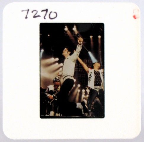 Michael Jackson and his brothers in "mid-flight" during their legendary performance on their world-wide Victory Tour circa 1984. These photos were commission by Joe Jackson, father, founder and early manager of his children, Michael Jackson and the Jackson 5. He hired the top music concert photographers of the day to take pictures of Michael Jackson and the Jackson Five (both in individual performances and as a group), while they were on tour, and during personal appearances, as well as at family get-together's. The purchase of this photo includes the original transparency, and includes a full copyright release for your own personal unlimited reproduction printing and selling to the winning bidder. They are the original 35 millimeter film used to take the picture, and are professionally mounted in “slide” paper for protection. The original film sprockets can be seen when the paper is removed. The color reversal film was used by these photographers, because, as is standard in the industry, this film stock creates more detailed images especially in Concert and low-light situations, and in many ways is actually superior to color negative film stock for reproduction purposes. Bidders are advised that Jackson Entertainment Corp. and the Estate of Michael Jackson have asserted a claim that they are the owners of the copyright in this photo and/or rights to the reproduction of Michael Jackson’s image. Bidders are advised that all proceeds from sales and delivery of the purchased items will be held by Premiere Props in escrow pending resolution of these claims unless the successful bidders assume the risk.