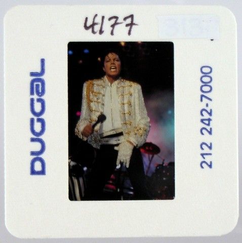 Michael Jackson, iconic glove in one hand, microphone in the other, in one of his most famous "poses" while doing a solo turn on his Victory Tour circa 1984. These photos were commission by Joe Jackson, father, founder and early manager of his children, Michael Jackson and the Jackson 5. He hired the top music concert photographers of the day to take pictures of Michael Jackson and the Jackson Five (both in individual performances and as a group), while they were on tour, and during personal appearances, as well as at family get-together's. The purchase of this photo includes the original transparency, and includes a full copyright release for your own personal unlimited reproduction printing and selling to the winning bidder. They are the original 35 millimeter film used to take the picture, and are professionally mounted in “slide” paper for protection. The original film sprockets can be seen when the paper is removed. The color reversal film was used by these photographers, because, as is standard in the industry, this film stock creates more detailed images especially in Concert and low-light situations, and in many ways is actually superior to color negative film stock for reproduction purposes. Bidders are advised that Jackson Entertainment Corp. and the Estate of Michael Jackson have asserted a claim that they are the owners of the copyright in this photo and/or rights to the reproduction of Michael Jackson’s image. Bidders are advised that all proceeds from sales and delivery of the purchased items will be held by Premiere Props in escrow pending resolution of these claims unless the successful bidders assume the risk.