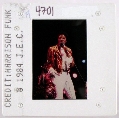 Michael Jackson in yet another magnificent outfit from his Victory Tour circa 1984. These photos were commission by Joe Jackson, father, founder and early manager of his children, Michael Jackson and the Jackson 5. He hired the top music concert photographers of the day to take pictures of Michael Jackson and the Jackson Five (both in individual performances and as a group), while they were on tour, and during personal appearances, as well as at family get-together's. The purchase of this photo includes the original transparency, and includes a full copyright release for your own personal unlimited reproduction printing and selling to the winning bidder. They are the original 35 millimeter film used to take the picture, and are professionally mounted in “slide” paper for protection. The original film sprockets can be seen when the paper is removed. The color reversal film was used by these photographers, because, as is standard in the industry, this film stock creates more detailed images especially in Concert and low-light situations, and in many ways is actually superior to color negative film stock for reproduction purposes. Bidders are advised that Jackson Entertainment Corp. and the Estate of Michael Jackson have asserted a claim that they are the owners of the copyright in this photo and/or rights to the reproduction of Michael Jackson’s image. Bidders are advised that all proceeds from sales and delivery of the purchased items will be held by Premiere Props in escrow pending resolution of these claims unless the successful bidders assume the risk.