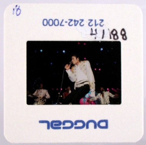 Michael Jackson working the crowd with his brothers behind him during their Victory Tour (the reunion of Michael Jackson and the "Jackson 5") circa 1984. These photos were commission by Joe Jackson, father, founder and early manager of his children, Michael Jackson and the Jackson 5. He hired the top music concert photographers of the day to take pictures of Michael Jackson and the Jackson Five (both in individual performances and as a group), while they were on tour, and during personal appearances, as well as at family get-together's. The purchase of this photo includes the original transparency, and includes a full copyright release for your own personal unlimited reproduction printing and selling to the winning bidder. They are the original 35 millimeter film used to take the picture, and are professionally mounted in “slide” paper for protection. The original film sprockets can be seen when the paper is removed. The color reversal film was used by these photographers, because, as is standard in the industry, this film stock creates more detailed images especially in Concert and low-light situations, and in many ways is actually superior to color negative film stock for reproduction purposes. Bidders are advised that Jackson Entertainment Corp. and the Estate of Michael Jackson have asserted a claim that they are the owners of the copyright in this photo and/or rights to the reproduction of Michael Jackson’s image. Bidders are advised that all proceeds from sales and delivery of the purchased items will be held by Premiere Props in escrow pending resolution of these claims unless the successful bidders assume the risk.