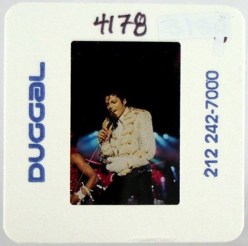 Michael Jackson reaching deep into the depths of his soul for "the sound" during his Victory tour circa 1984. These photos were commission by Joe Jackson, father, founder and early manager of his children, Michael Jackson and the Jackson 5. He hired the top music concert photographers of the day to take pictures of Michael Jackson and the Jackson Five (both in individual performances and as a group), while they were on tour, and during personal appearances, as well as at family get-together's. The purchase of this photo includes the original transparency, and includes a full copyright release for your own personal unlimited reproduction printing and selling to the winning bidder. They are the original 35 millimeter film used to take the picture, and are professionally mounted in “slide” paper for protection. The original film sprockets can be seen when the paper is removed. The color reversal film was used by these photographers, because, as is standard in the industry, this film stock creates more detailed images especially in Concert and low-light situations, and in many ways is actually superior to color negative film stock for reproduction purposes. Bidders are advised that Jackson Entertainment Corp. and the Estate of Michael Jackson have asserted a claim that they are the owners of the copyright in this photo and/or rights to the reproduction of Michael Jackson’s image. Bidders are advised that all proceeds from sales and delivery of the purchased items will be held by Premiere Props in escrow pending resolution of these claims unless the successful bidders assume the risk.
