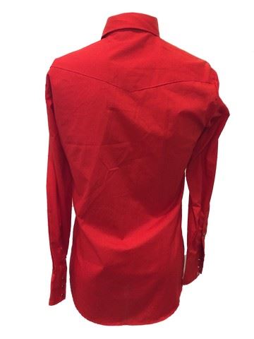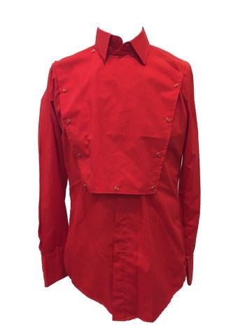 Michael Jackson concert worn, "Gold Collection by Karman" red, western style dress shirt with bib front and round, red jeweled snaps.