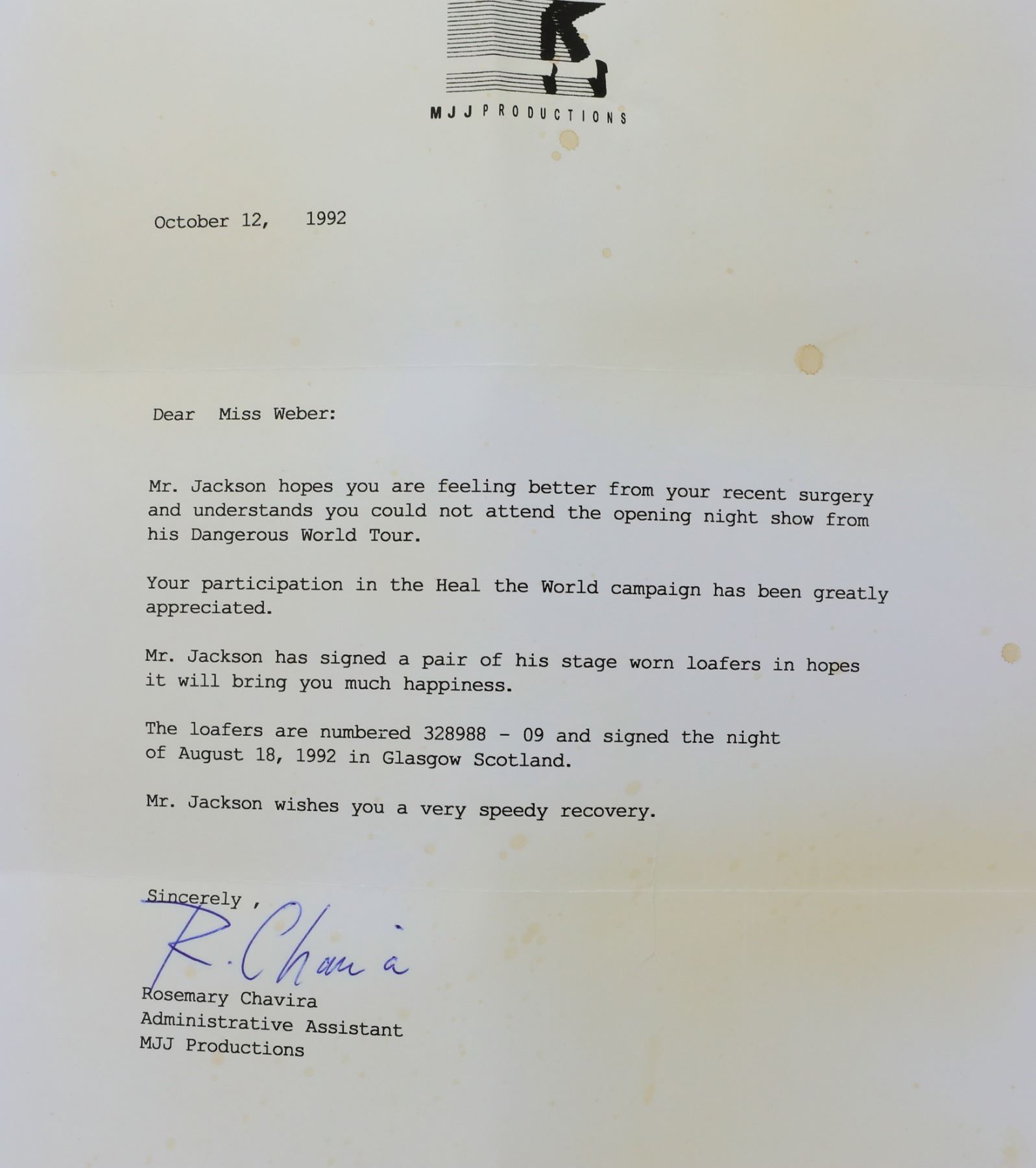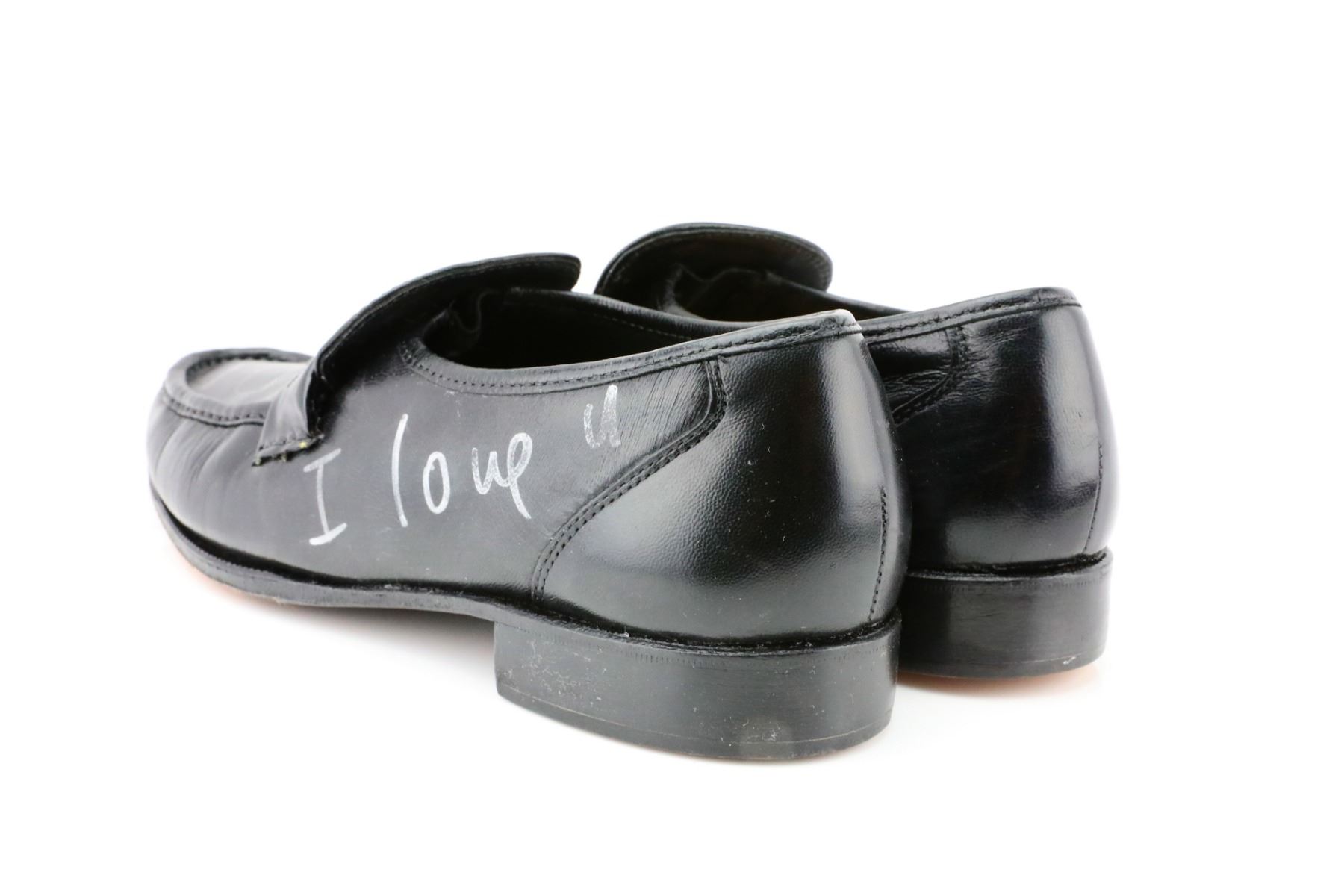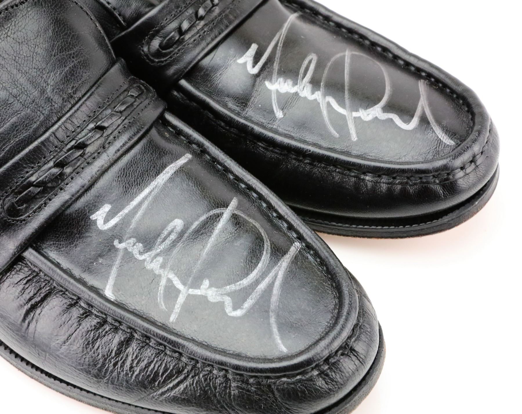 Michael Jackson Stage Worn Signed Florsheim Loafers W/Letter From MJJ Productions, Dangerous Tour Pin, Photograph & Vinyl Albums - These loafers were personally owned by Michael Jackson, and were stage worn. The black Florsheim loafers will be accompanied by a letter from MJJ productions, which states that they were signed by Michael on the night August 18, 1992 in Glasgow, Scotland, where he was performing during his Dangerous World Tour. The loafers are signed on the top of both, and also have "I love u" signed across the side of the left shoe. The shoes were gifted to a fan of Michael Jackson who participated in his "Heal the World" campaign and was to attend the opening night of the Dangerous Tour but was unable due to surgery. This incredible piece of memorabilia will be accompanied by a vintage Dangerous World Tour souvenir pin, a promotional photograph of Michael Jackson from the period, and several vinyl albums related to his Dangerous album. The loafers are numbered on the inside, and are size 9D. If you would like more information regarding the provenance or authenticity of this piece, please email brigitte@gwsauctions.com.