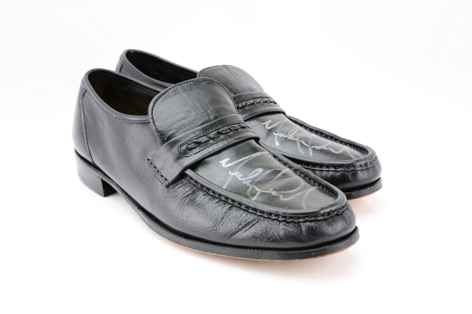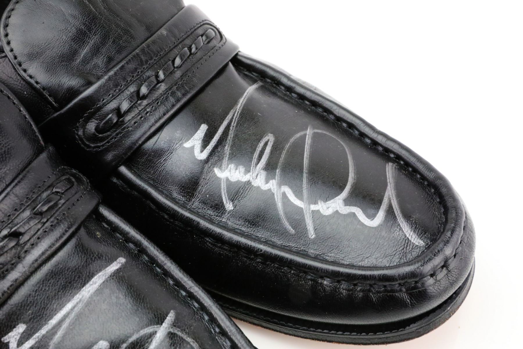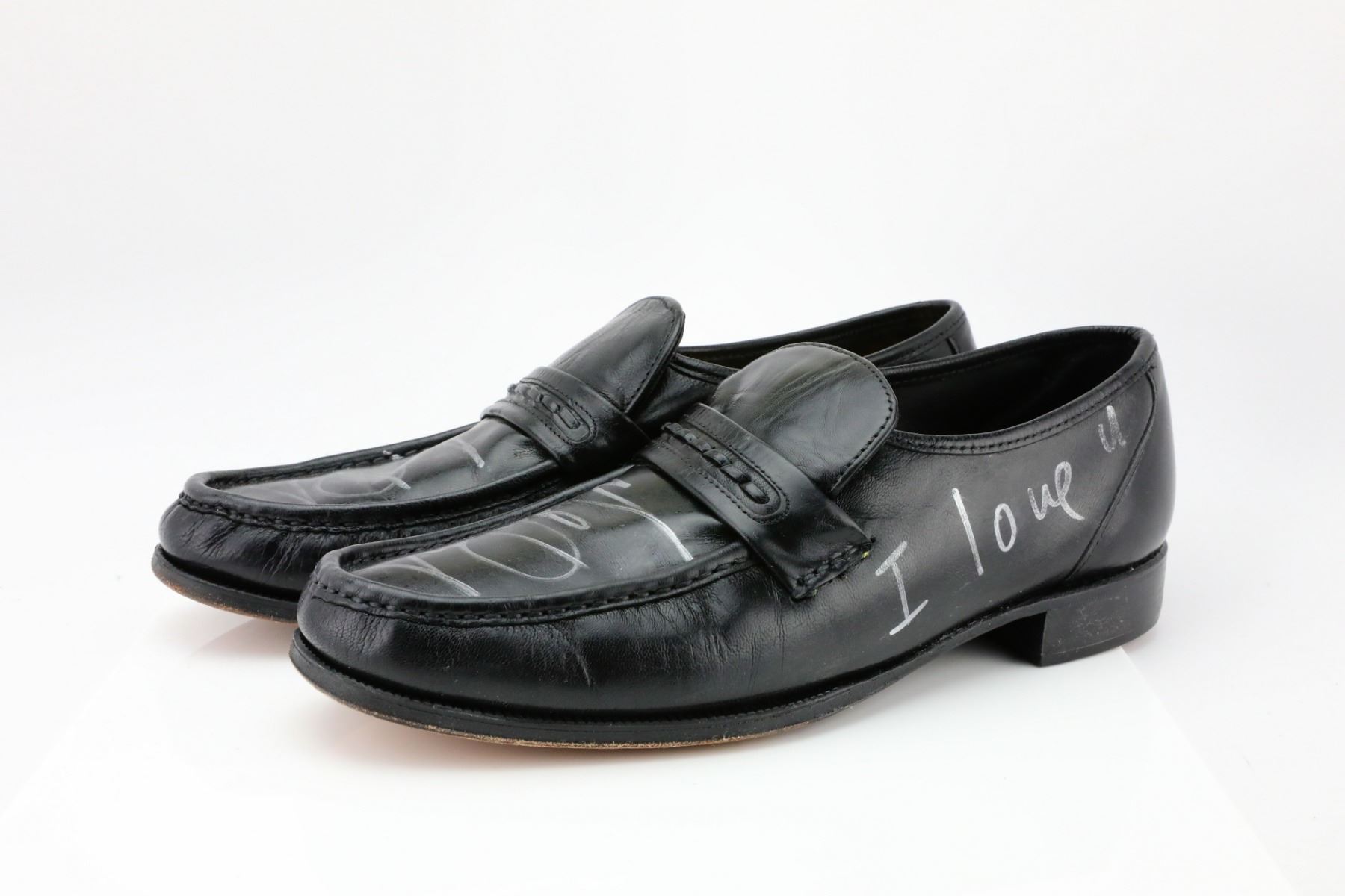 Michael Jackson Stage Worn Signed Florsheim Loafers W/Letter From MJJ Productions, Dangerous Tour Pin, Photograph & Vinyl Albums - These loafers were personally owned by Michael Jackson, and were stage worn. The black Florsheim loafers will be accompanied by a letter from MJJ productions, which states that they were signed by Michael on the night August 18, 1992 in Glasgow, Scotland, where he was performing during his Dangerous World Tour. The loafers are signed on the top of both, and also have "I love u" signed across the side of the left shoe. The shoes were gifted to a fan of Michael Jackson who participated in his "Heal the World" campaign and was to attend the opening night of the Dangerous Tour but was unable due to surgery. This incredible piece of memorabilia will be accompanied by a vintage Dangerous World Tour souvenir pin, a promotional photograph of Michael Jackson from the period, and several vinyl albums related to his Dangerous album. The loafers are numbered on the inside, and are size 9D. If you would like more information regarding the provenance or authenticity of this piece, please email brigitte@gwsauctions.com.