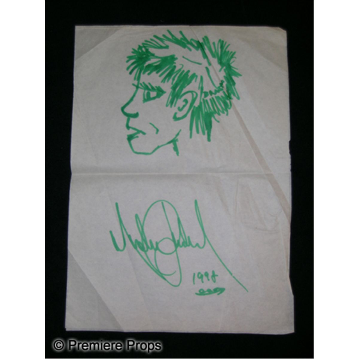 Hand-rendered drawing by the King of Pop, Michael Jackson, in green ink of a sad boy in profile. Signed by MJ in 1995 but dated to 1998. Why? If one looks at the beginning of the book Moonwalk, MJ has signed his drawing with his name and with the year 1998. Michael always thought his death would come about in that year. (approx. 8" x 12")