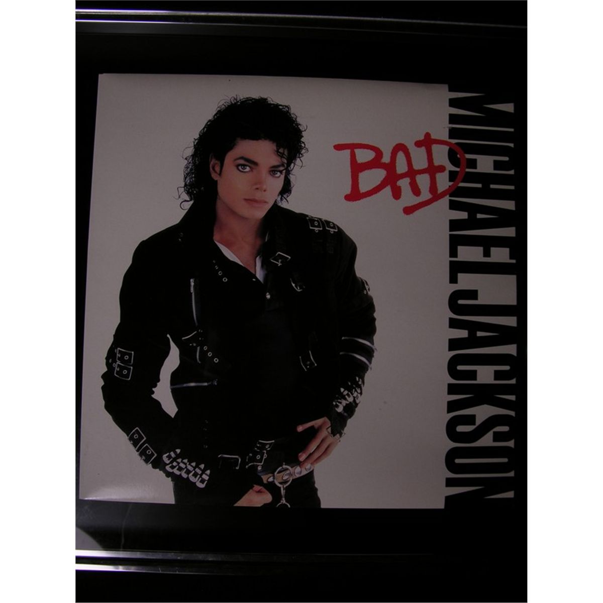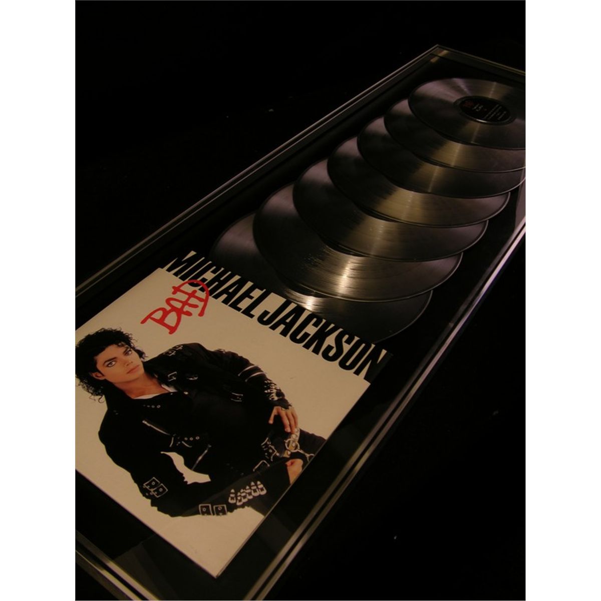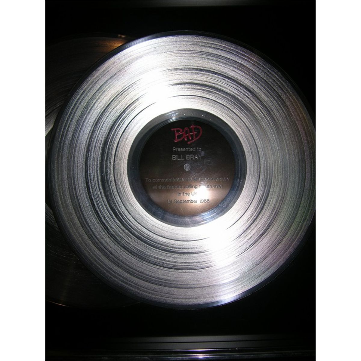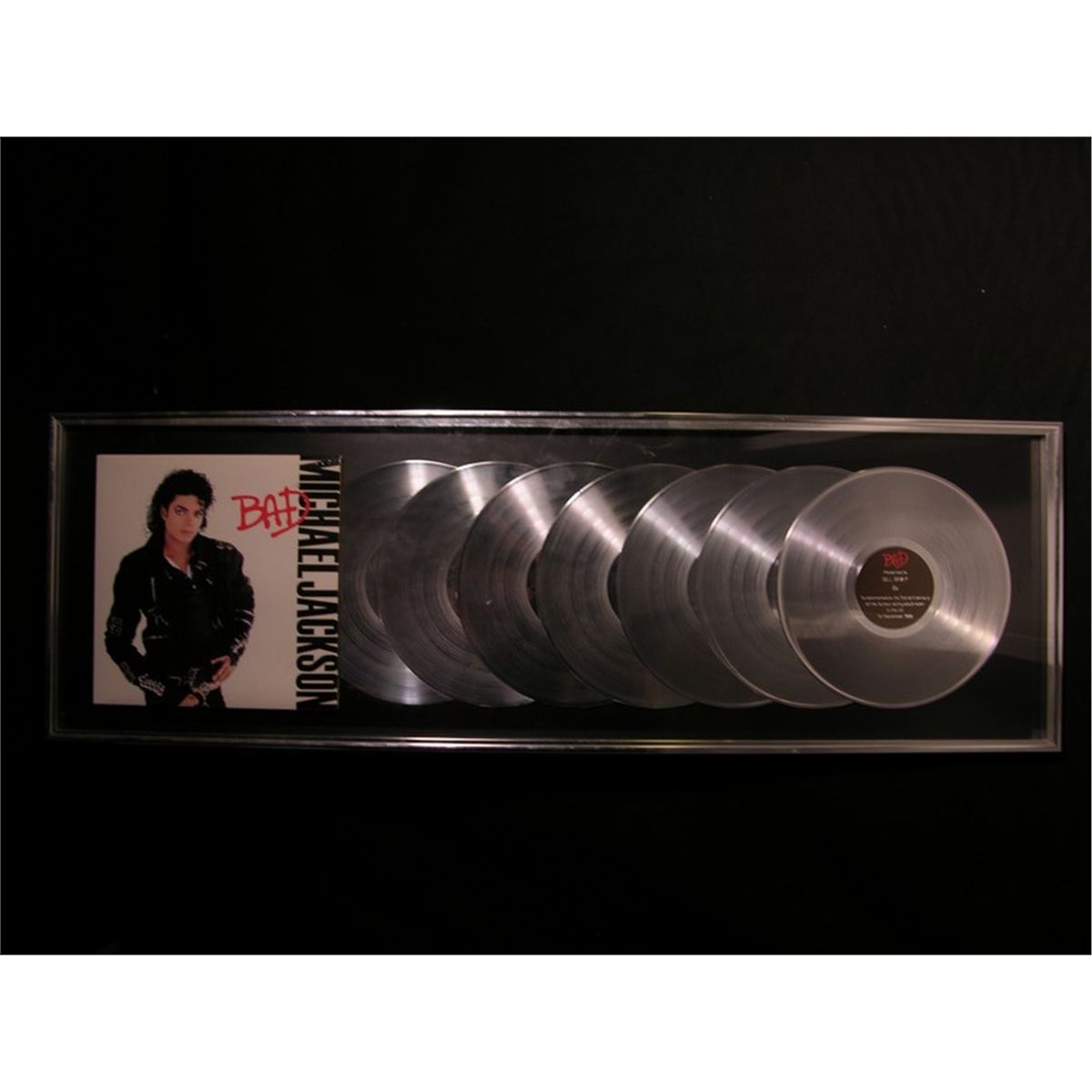 Framed series of platinum records for Michael Jackson's Bad, presented to Bill Bray, a close friend of Jackson's as well as being his chief of security. The final platinum record of the display is engraved thusly: "Presented To Bill Bray T o Commemorate the First Anniversary of the Fastest Selling Album Ever in the UK. 1st September, 1988. Beautiful, very desirable piece. (51x16.5x2). Oversized item. Additional postage required.