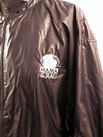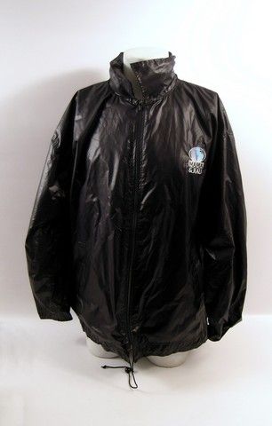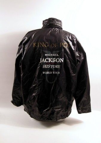 A limited edition Michael Jackson crew jacket , worn by one of Jackson's main long-time crew members, Robert Karasek. On the back is printed 'KING OF POP" in gold, and under that "MICHAEL JACKSON HISTORY WORLD TOUR". The "MJ" trademark initials are printed in shadow gray behind it. The official "MAMA & RAU CONCERTS" logo is embroidered on the right front. The Ana Anakos Creation Exclusive Fashion Label is inside. Made of luxurious waterproof material to stand the sudden weather changes of one of the greatest world musical tours of all time. It also includes a zip pocket with a hidden hoodie. In one of the hand pockets are several Peppermint Lifesavers in their original foil, which was Jackson's favorite candy! (Black & XL).