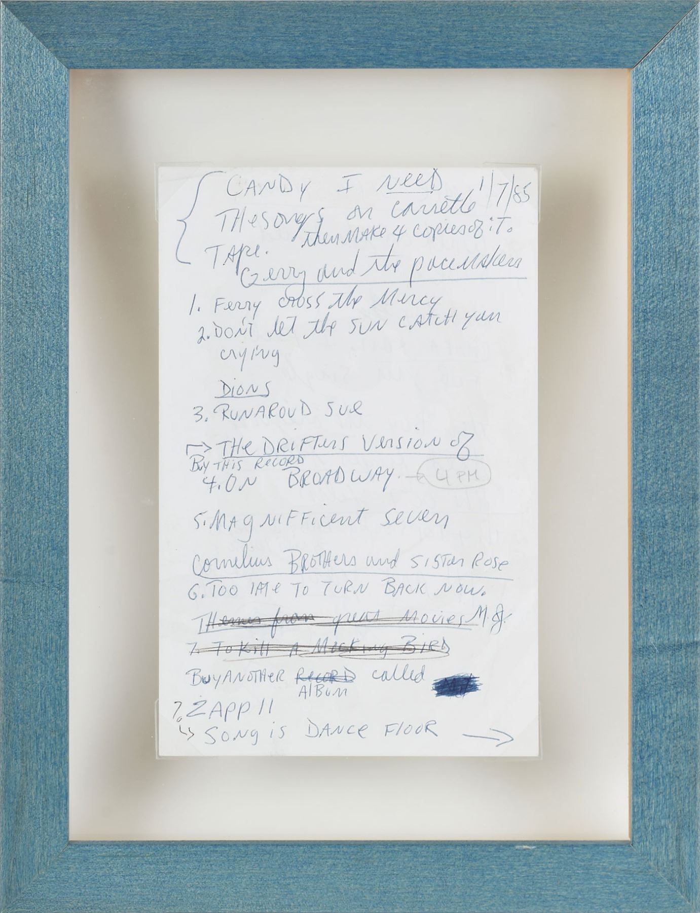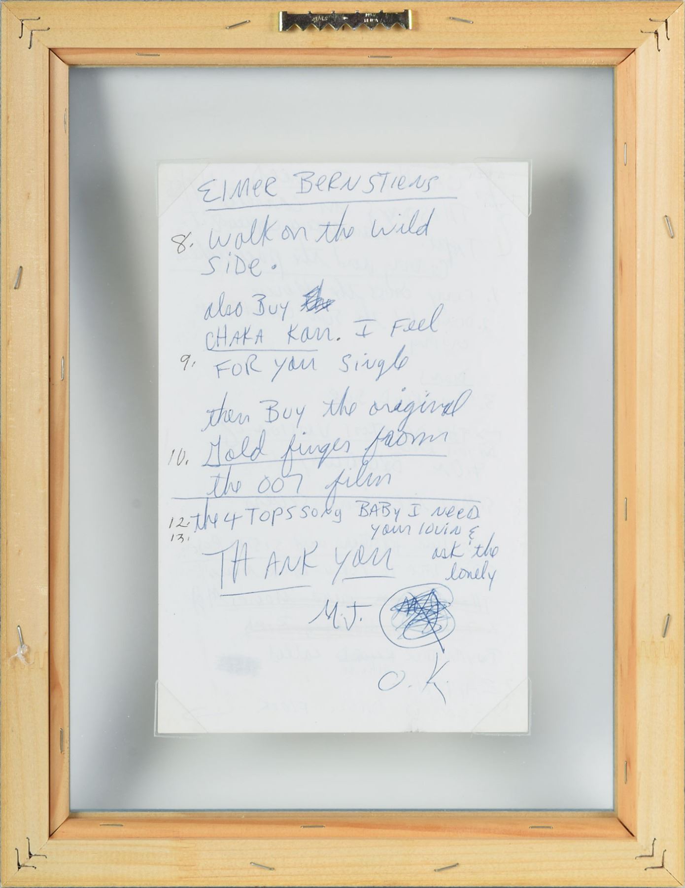 Handwritten notes by Michael Jackson, who signs twice with his initials, "M. J.," one page, both sides, 5.5 x 8.5, January 7, 1985. Jackson makes a list of notes in ballpoint for his personal assistant, in full (spelling and grammar retained): "Candy I need the songs on cassette tape. Then make 4 copies of it. Gerry and the pacemakers. 1. Ferry cross the Mercy, 2. Don't let the sun catch you crying, Dions, 3. Runaroud Sue, Buy this record The Drifters Version of 4. On Broadway, 5. Magnifficent Seven, Cornelius Brothers and Sister Rose, 6. Too late to turn back now. [A secretarial hand has struck through the following sentence: "Themes from great movies, 7. To Kill a Mocking Bird"] M. J., Buy another album called 7. Zapp II, Song is Dance Floor, Elmer Bernstiens, 8. Walk on the wild side. Also Buy Chaka Kan. 9. I feel for you single then buy the original 10. Gold finger from the 007 film, 12. the 4 Tops song Baby I need your lovin & ask the lonely, 13. Thanks you, M. J., O. K." Graphite and darker numerals done in a secretarial hand. Framed without backing to an overall size of 10 x 13. In fine condition.