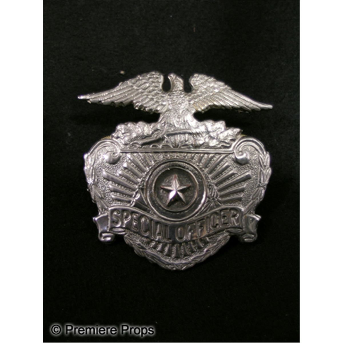 Metallic Special Officer hat badge, worn by Michael Jackson as part of a special costume during his Bad era of the late 1980s. Features two attachments. (approx. 2 1/2" long)