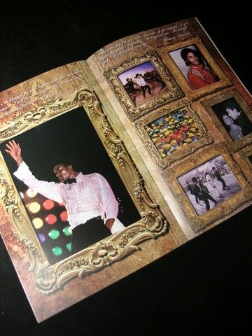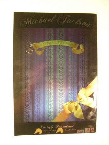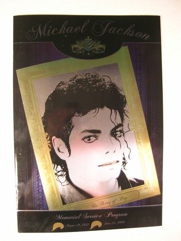 This is a glossy, 16 page program from the Michael Jackson Memorial Service on July 7, 2009. These programs with the two gold emblems on the lower front cover were given out to family and friends only and were not available to the general public. The program features a biography, photos, and comments from Michael throughout the years, as well as some never befroe seen photos from Mrs. Katherine Jackson's private collection. A beautiful program and lasting tribute to the unequivocal King of Pop. (measures approx 13 1/2"x 9 1/4")