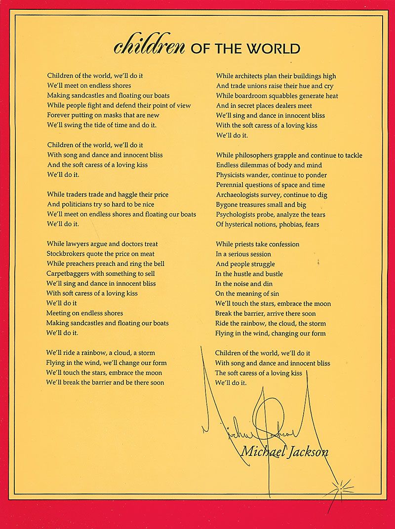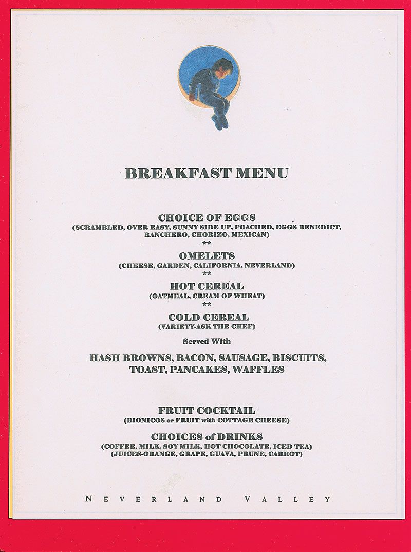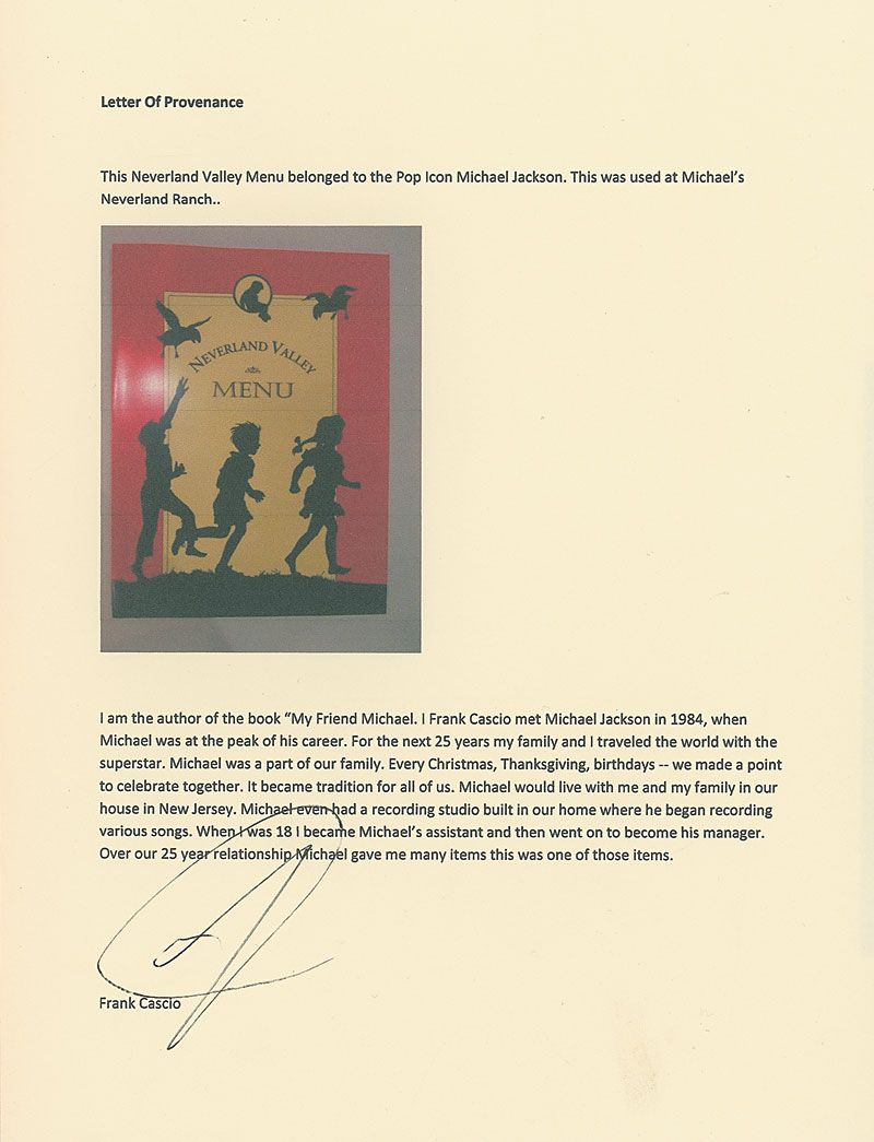 Uncommon Neverland Valley breakfast menu, owned by Jackson and used at his ranch in California. Color menu measures 9 x 12, and features silhouettes of birds and children on the front cover. Inside features a printed poem written by Jackson entitled ‘Children of the World,’ with the breakfast menu affixed on the opposite page. Accompanied by a letter of provenance from Jackson’s former manager, Frank Cascio, which states, in part: “This Neverland Valley Menu belonged to the Pop Icon Michael Jackson. This was used at Michael’s Neverland Ranch…Over our 25 year relationship Michael gave me many items this was one of those items.” In fine condition.