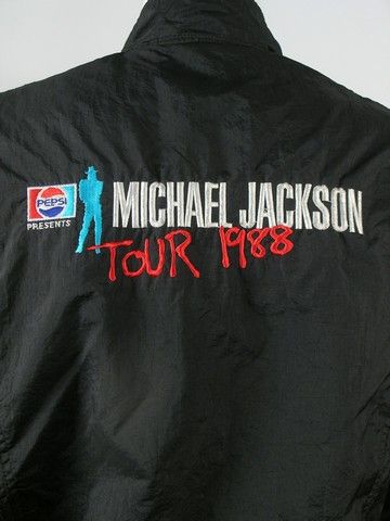 From Michael Jackson's blockbuster "BAD" tour (1988), this is one of the official limited edition tour jackets. In black(size L) with silver buckles and straps. "Michael Jackson Tour 1988" with a "Pepsi Presents" logo also embroidered on the back, and a MJJ Productions (Michael Jackson's company), Logo and title embroidered on the right shoulder. Also has the name "Jorge" embroidered on the inside of the jacket.