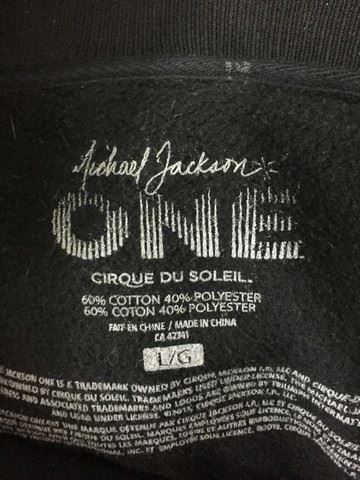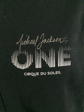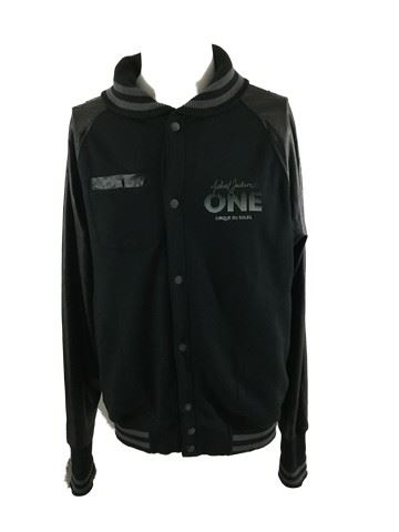 Michael Jackson One by Cirque du Soleil Letterman Jacket with show logo on back. Front left breast area has "Michael Jackson One Cirque du Soleil" opposite a small pocket on right breat area. Color is black on black, made of 60% cotton/40% polyester torso, faux leather sleeves with stretchable cotton/elastic material at end. Neck and waist portion of jacket is also composed of the same stretchable fabric.
