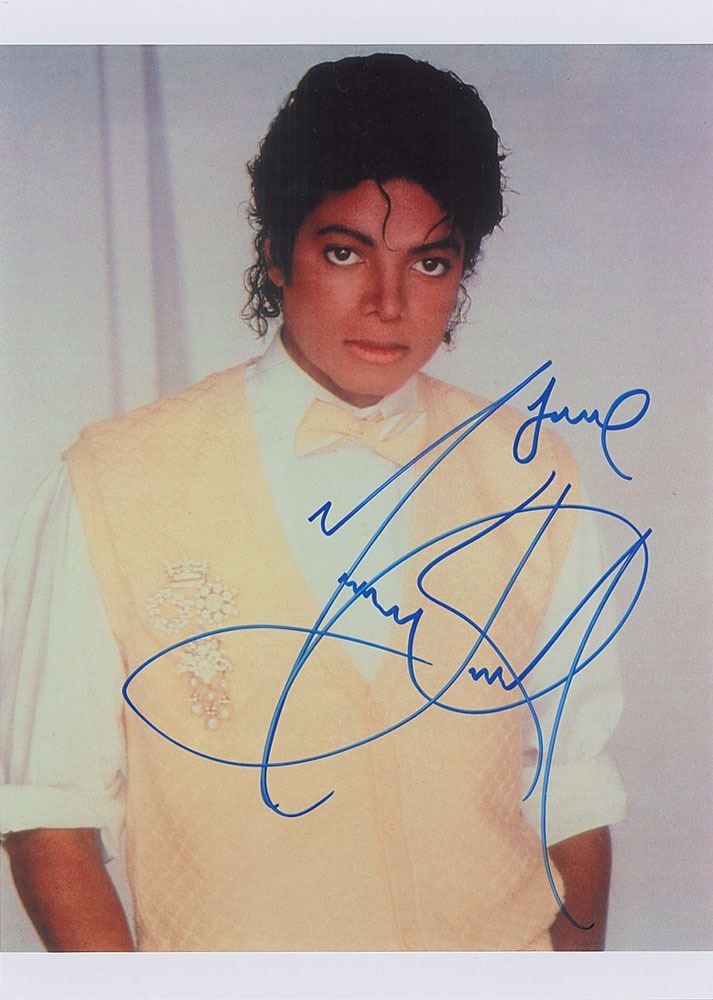 Color glossy 10 x 14 half-length photo of Jackson in a gold sweater-vest and bow tie, signed in blue felt tip, “Love, Michael Jackson.” In fine condition. Accompanied by a full letter of authenticity from REAL.