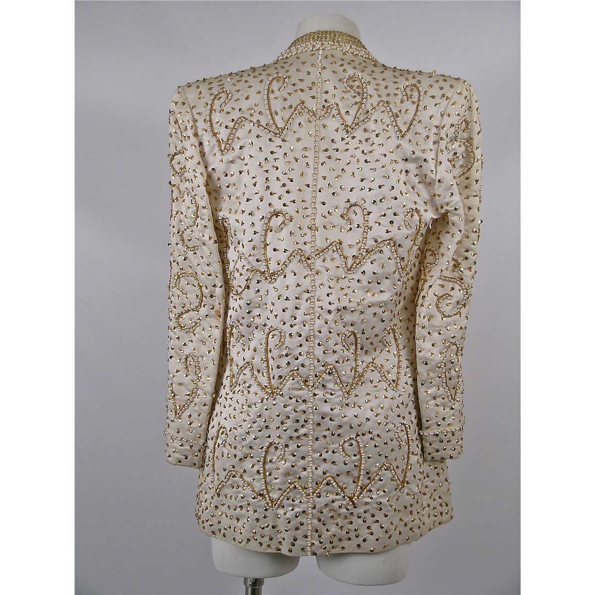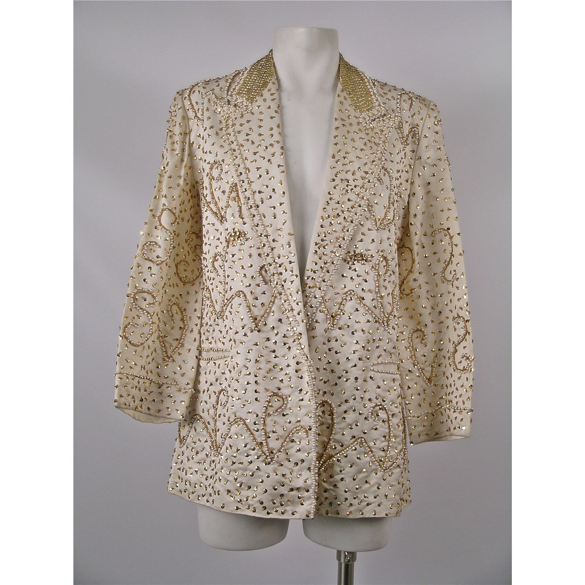 A stunning Michael Jackson collectable! A true Wow! This is Michael Jackson's personal white beaded jacket worn by Mr. Jackson throughout the 1990's during his "Dangerous" period. It was custom made for him with intricate gold beaded and faux-pearls in his iconic "upside down M'S" design, and beautifully patterned with gold sequence. It comes from famed concert promoter and media personality David Gest's personal Jackson collection and was given to Mr. Gest during the time "Black or White" became a hit song. Includes a Letter of Authenticity from Mr. Gest, as well as a Letter of Authenticity from "The Rock & Roll Pop Culture Auction" "Gotta Have Rock And Roll" Auction House.