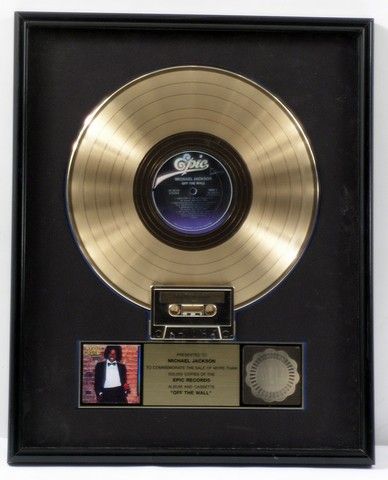 The official RIAA gold record award presented to Michael Jackson to commemorate the sale of more than 500,000 copies of the Epic Records album and cassette "Off The Wall". Includes the "Off The Wall" record in gold, plus a gold cassette, a commemorative plaque, the official RIAA plaque seal, and a picture of Mr. Jackson. All mounted in a custom made display with plexiglass cover. Includes the silver Fitzgerald Hartley Marketing label on the back. (Display approx 17"x21").