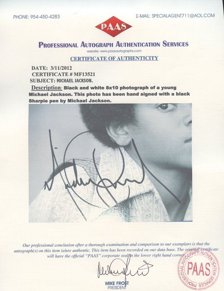 Hand-signed in black felt-tip pen by Michael Jackson. Autograph includes a Professional Autograph Authentication Services (PAAS) Hologram and matching LOA for authenticity purposes.