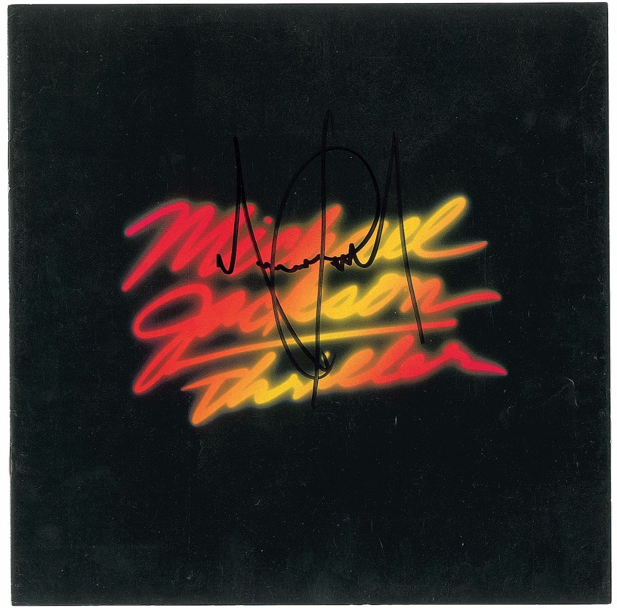 Thriller album insert signed in person on the front cover in black felt tip by Jackson. In fine condition, with some light handling wear. The record is not included. Originally obtained by in-person specialist Mike Wehrmann.