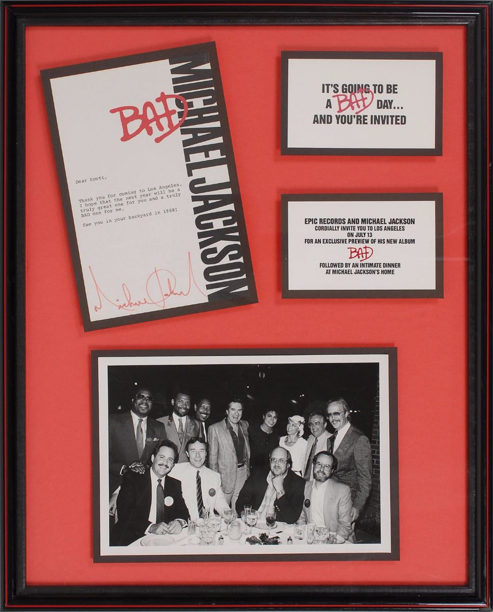 Exceptional invitation related to the forthcoming release of Michael Jackson’s 1987 album Bad, 6 x 9, signed at the conclusion in red felt tip. In part: “Thank you for coming to Los Angeles. I hope that the next year will be a truly great one for you and a truly BAD one for me. See you in your backyard in 1988!” Nicely displayed with a photo of Jackson posing with a group of people at a dinner, and two printed invitation cards, “It’s going to be a BAD day…and you’re invited” and “Epic Records and Michael Jackson cordially invite you to Los Angeles on July 13 for an exclusive preview of his new album BAD, followed by an intimate dinner at Michael Jackson’s home.” Framed to an overall size of 16.75 x 21. Retains its original Fitzgerald Hartley backing. In fine condition.