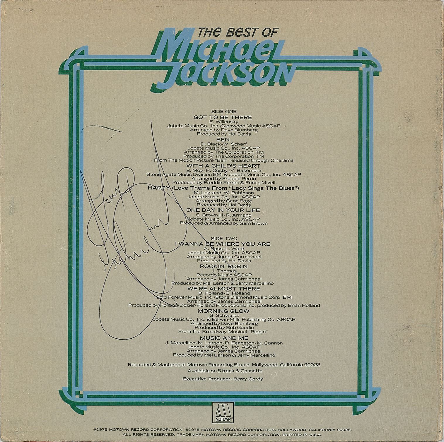 The Best of Michael Jackson album signed on the back cover in black ballpoint, "Love, Michael Jackson." In very good to fine condition, with light scuffing and old price sticker residue. The record is included.