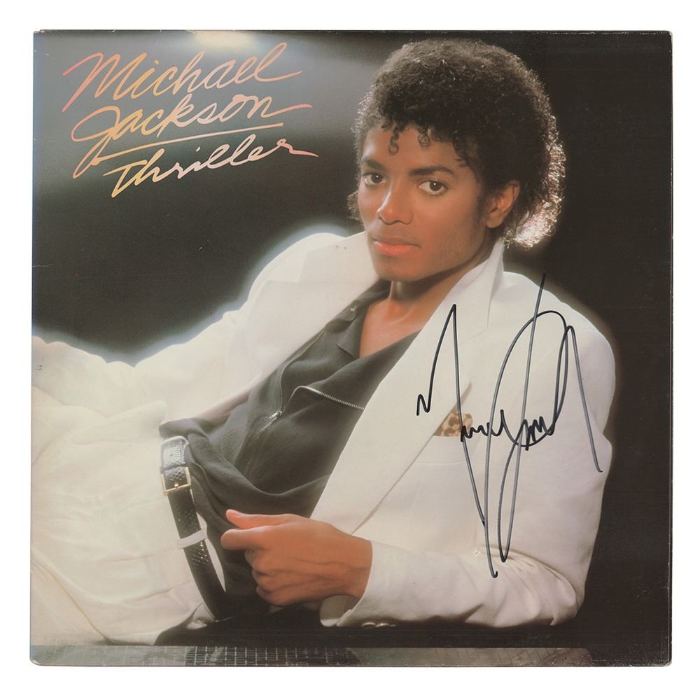 Thriller album by Michael Jackson, signed prominently on the front cover in black felt tip. In fine condition. The record is included.