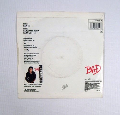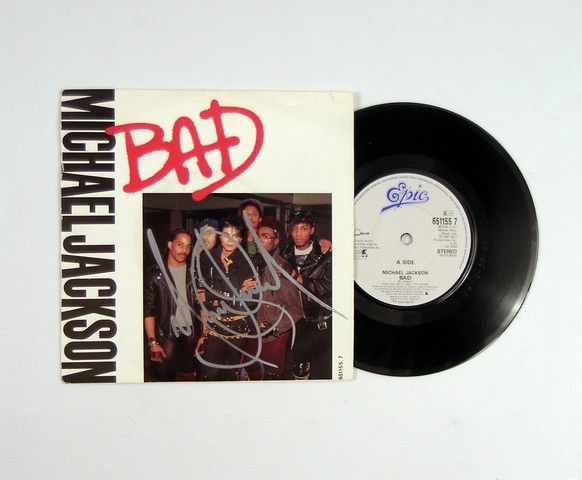 A rare 1987 Epic release 45 of Michael Jackson massive hit single "Bad". Side A has the actual song, and Side B the Dance Remix Radio Edit. In the original sleeve, and personally signed in gray ink by Michael Jackson.