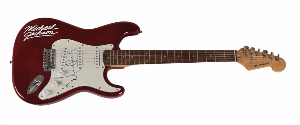 Extremely appealing red sparkle New York Pro 'stratocaster style' electric guitar, signed on the white pickguard in black felt tip by Michael Jackson. Body of guitar features an affixed white Jackson logo. In fine condition. A decidedly uncommon format signed by the 'King of Pop'—the first Jackson-signed guitar we have offered in over seven years.