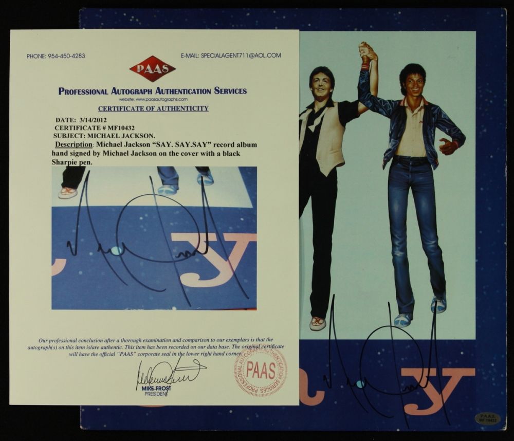 Hand-signed in black felt-tip pen by Michael Jackson (D 2009). Album can not be seen in pictures but is included in the auction. Autograph includes an official hologram from Professional Autograph Authentication Services (PAAS) and matching LOA for authenticity purposes.