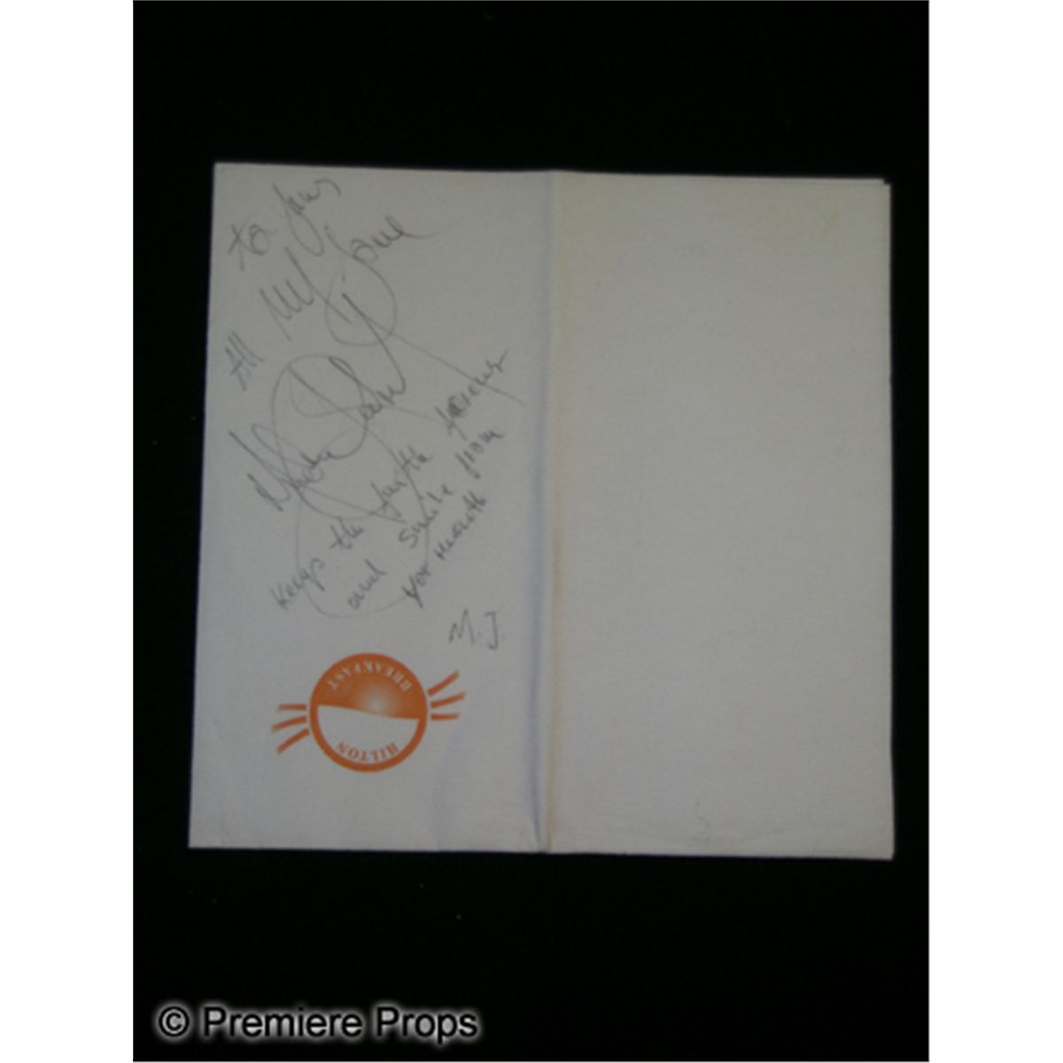 White napkin from the Hilton Hotel, signed and inscribed by Michael Jackson in the following manner "All my love, Michael Jackson - Keep the faith always and smile from your heart. M.J."
