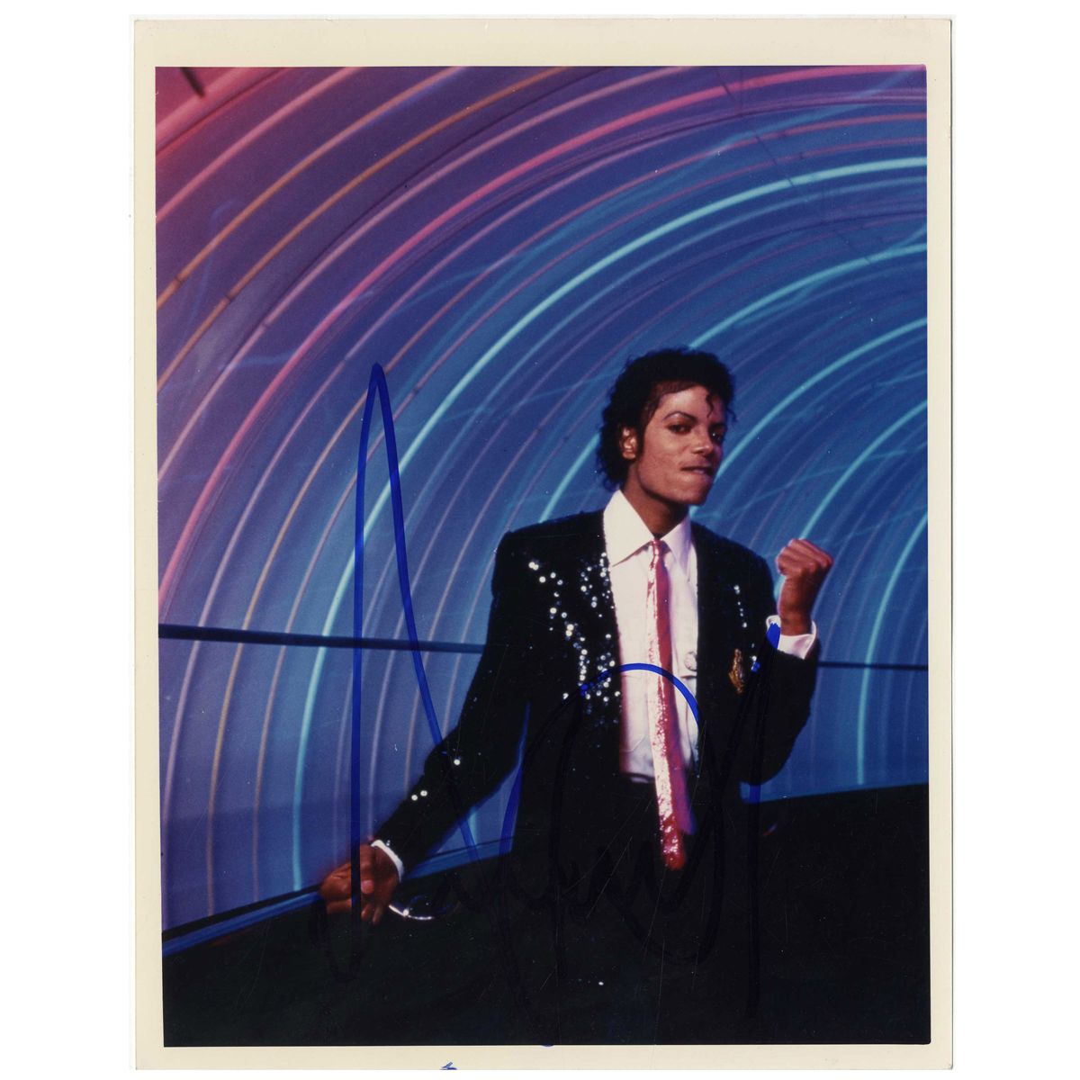 8'' x 10'' glossy signed photo of Michael Jackson wearing one of his signature sequined jackets and dancing in a neon-lit tunnel. Bold, large signature in blue ink. .5'' white borders all around. Some scuffing and a small mark on the bottom border; very good condition. Accompanied by COA from in-person autograph specialist Michael Wehrmann.