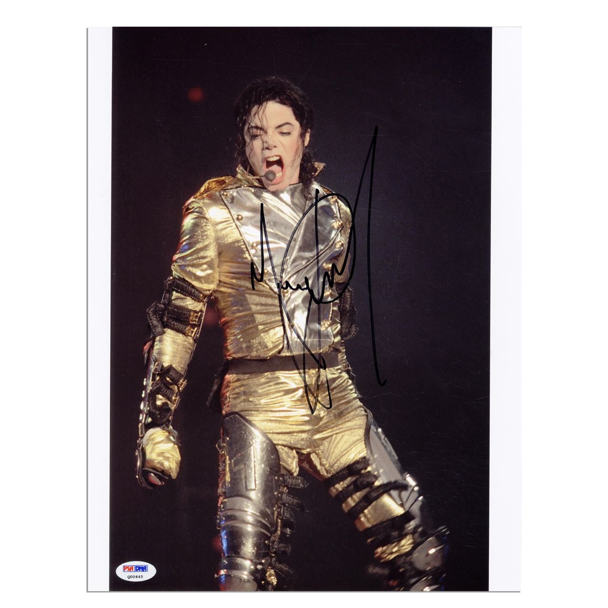 Michael Jackson signs his name with giant letters rendered in black marker across his gold suit on this photograph, capturing the King of Pop in his element, performing on stage. Huge 11'' x 14'' glossy photo is in fine condition, accompanied by a PSA/DNA COA.