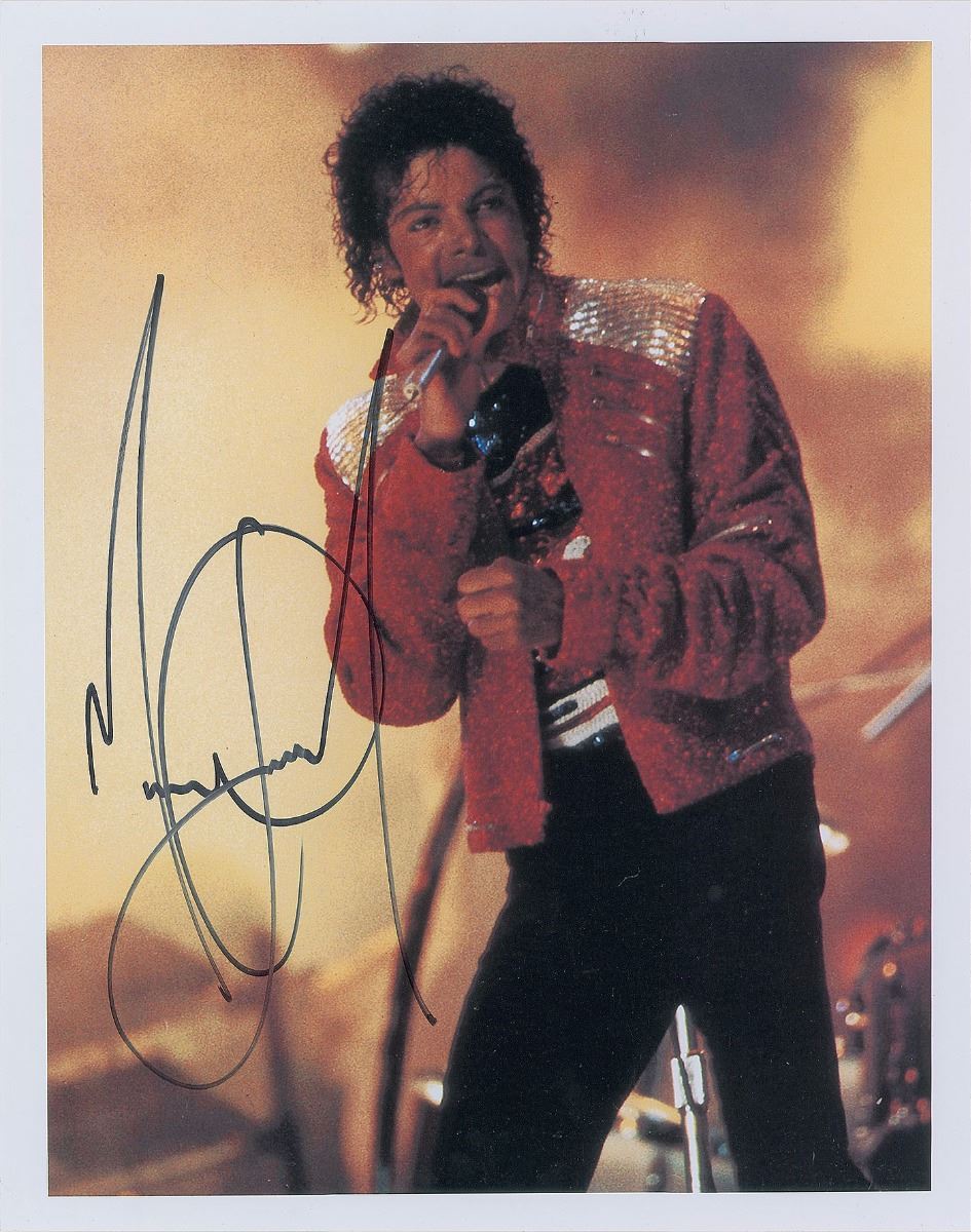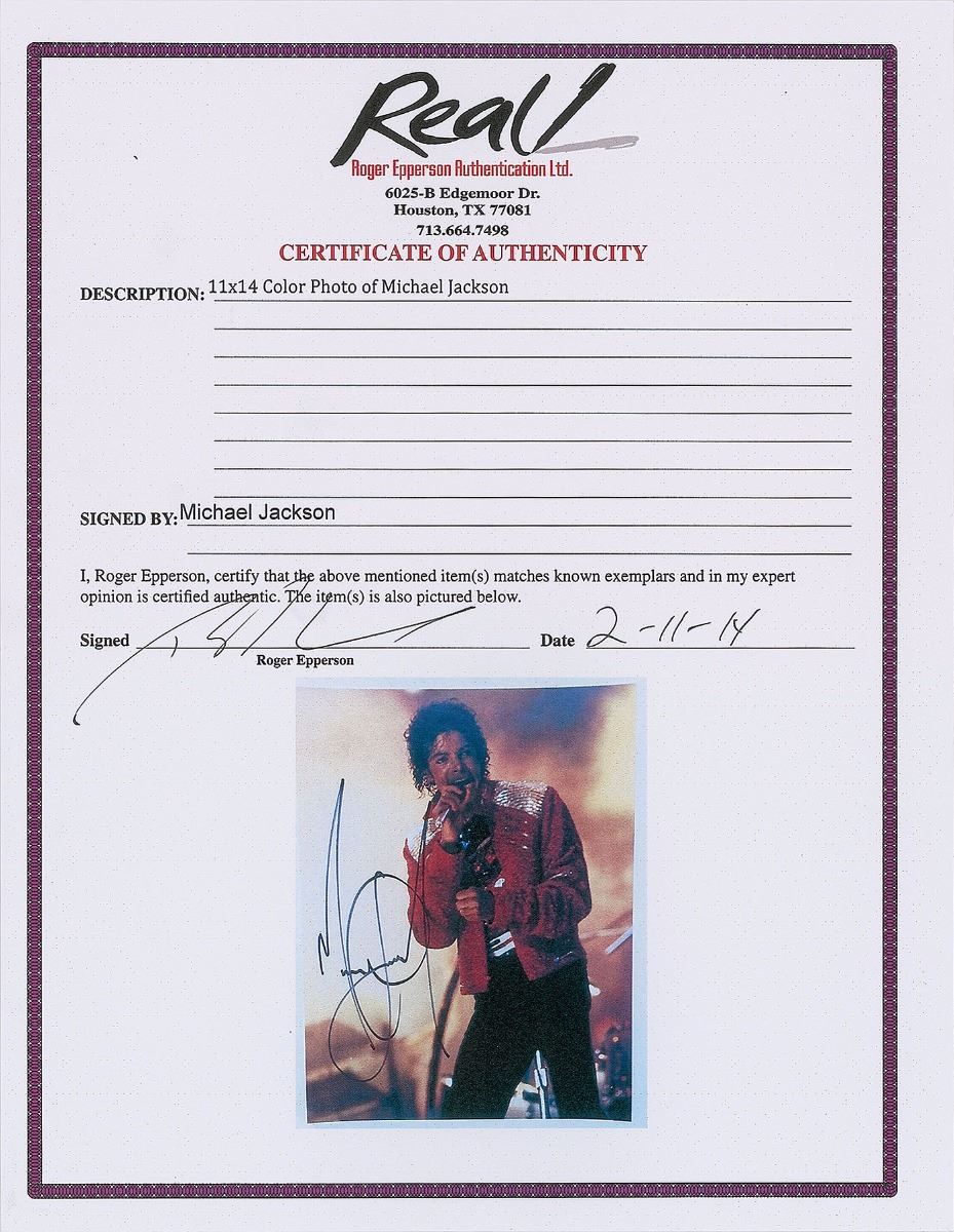 Color satin-finish 11 x 14 photo of Jackson singing on stage during his prime, prominently signed in black felt tip. In fine condition, with a slightly grainy quality to the image. Accompanied by a full letter of authenticity from REAL.