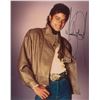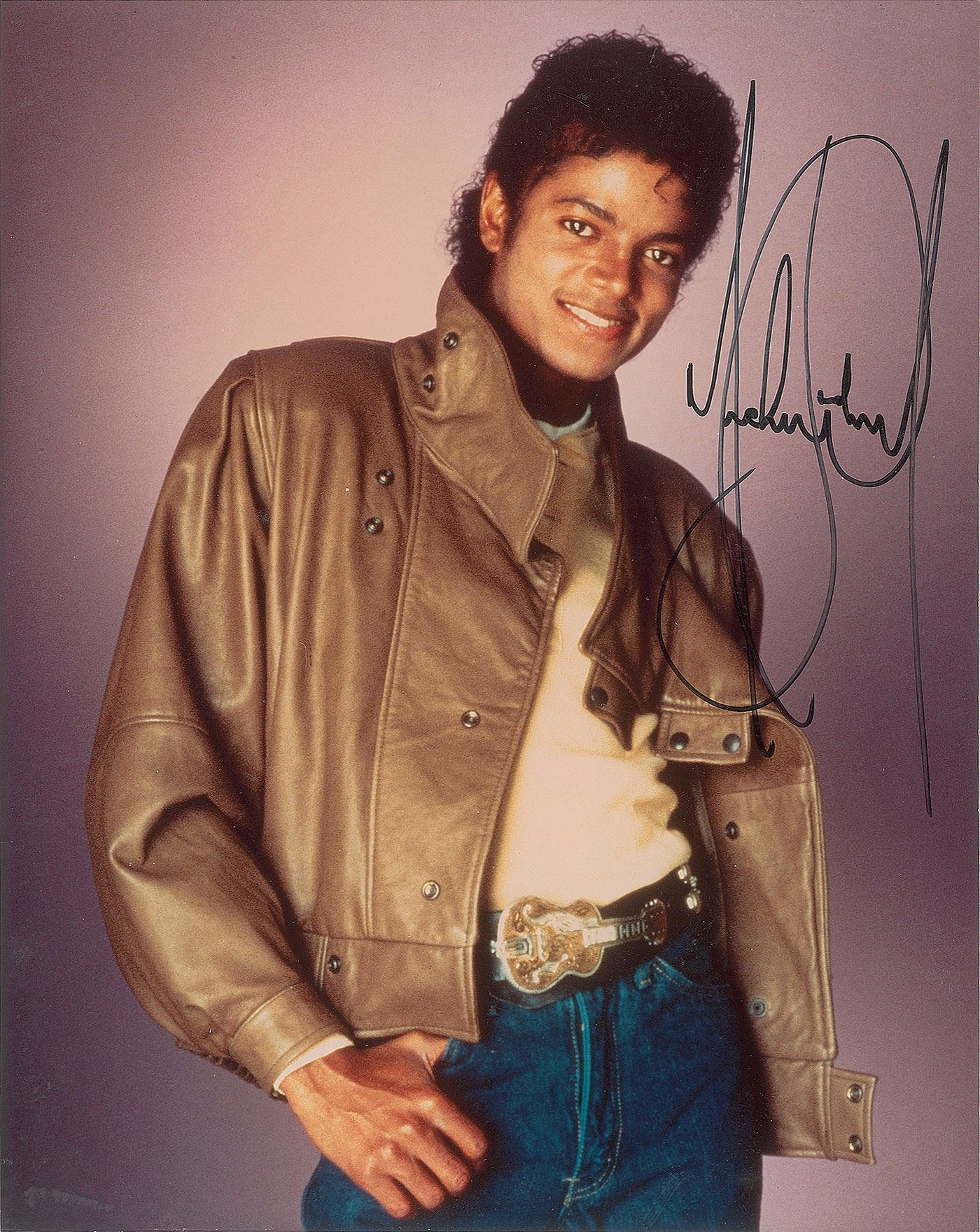 Excellent color glossy 8 x 10 half-length photo of Jackson wearing a beige leather jacket and a large guitar belt buckle, nicely signed in black felt tip. In fine condition, with scattered creasing. Accompanied by a full letter of authenticity from REAL.