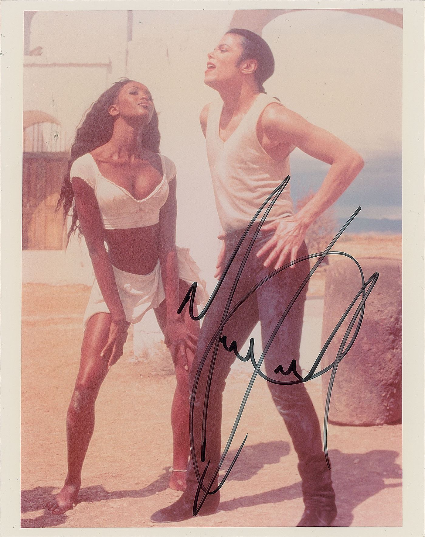 Color glossy 8 x 10 photo of Jackson dancing with model Naomi Campbell during the steamy video for the 1992 single 'In the Closet,' signed in black felt tip by Jackson. In fine condition. Originally obtained by in-person specialist Mike Wehrmann.