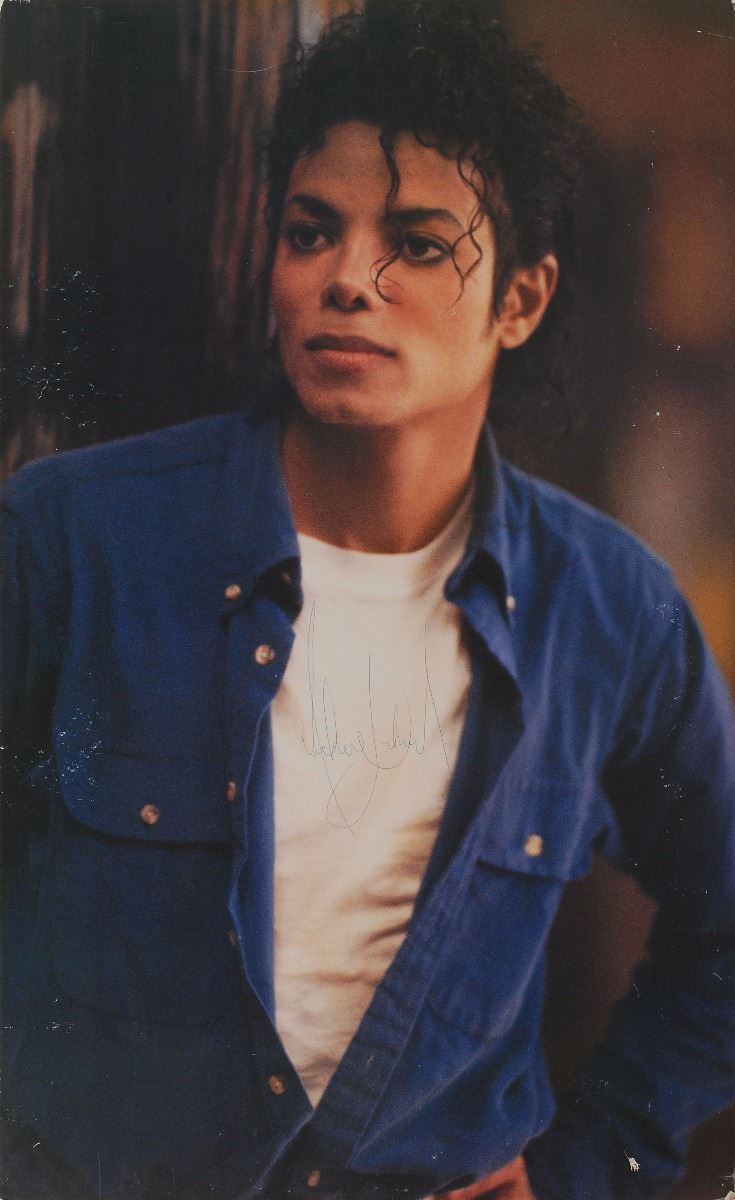 Fantastic color 22 x 35.5 poster of Jackson, prominently signed on his chest area in blue ballpoint. Mounted to a same-size piece of heavyweight cardstock. In very good to fine condition, with some scuffing and wear to edges. An earlier and fuller signature than typically seen of the magnetic pop legend.