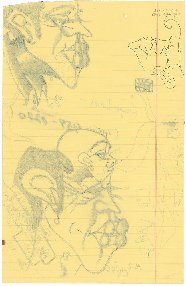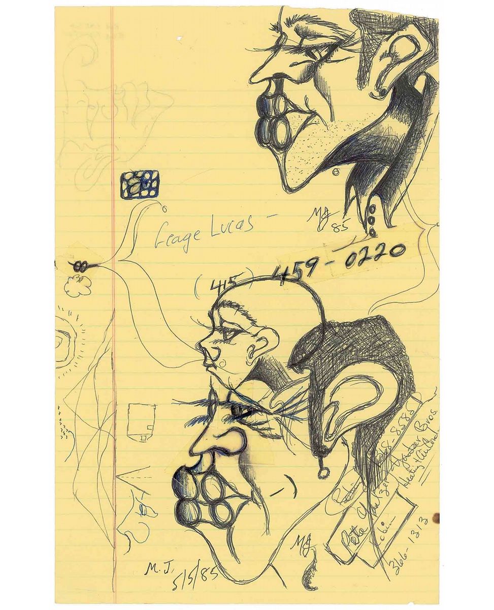 Unique and important assemblage of three original ballpoint sketches and several small doodles on an 8.5 x 13 yellow sheet of legal paper. Two large images appear to be over-exaggerated self-portrait caricatures, with a third smaller image appearing to be a bald woman. Both the larger sketches are signed, “M. J.,” and dated 1985. Sheet also bears several handwritten notes, a number, and the quickly written name of George Lucas. Reverse bears one more unsigned caricatures of Jackson sporting a pompadour. Scattered creases, a couple of small tears, and a piece of tape over phone number, otherwise fine condition. Potentially subconscious insight into Michael Jackson’s inner thoughts, especially considering the extreme steps ventured to alter his own appearance. A compelling offering that would make for a notable display.