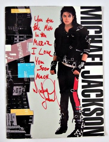The rare official program for Michael Jackson's World Tour 1988, in good condition with al the "cutouts", "popup", etc. On the front Michael Jackson has handwritten in red ink: "You are the man in the mirror - I love you sooo much" (signed) Michael Jackson. The program was signed to one of Michael's special fans turing the tours European leg. Program is 10"x13.5". Program shows some signs of "crease wear".