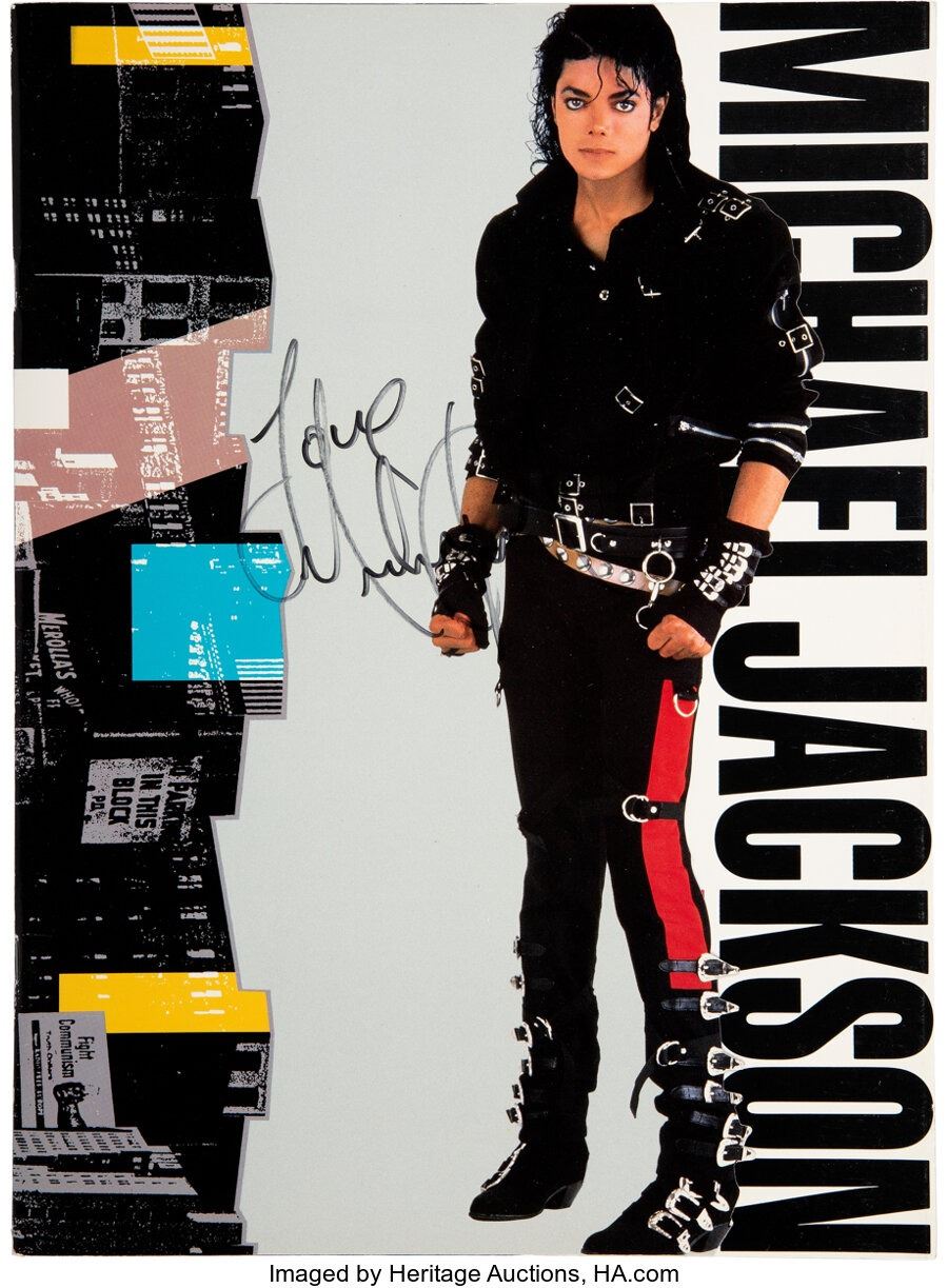 Michael Jackson Signed and InscribedBadProgram (1988). A photo-only tour program for the 1988 tour behind Michael Jackson's Bad, signed on the cover (and inscribed "Love") with a black felt tip by the King of Pop. Includes fold-outs and a Pepsi advertisement. Measures 9 ¾" x 13 ½". In Near Mint Minus condition with light creasing along the spine. COA from Heritage Auctions.