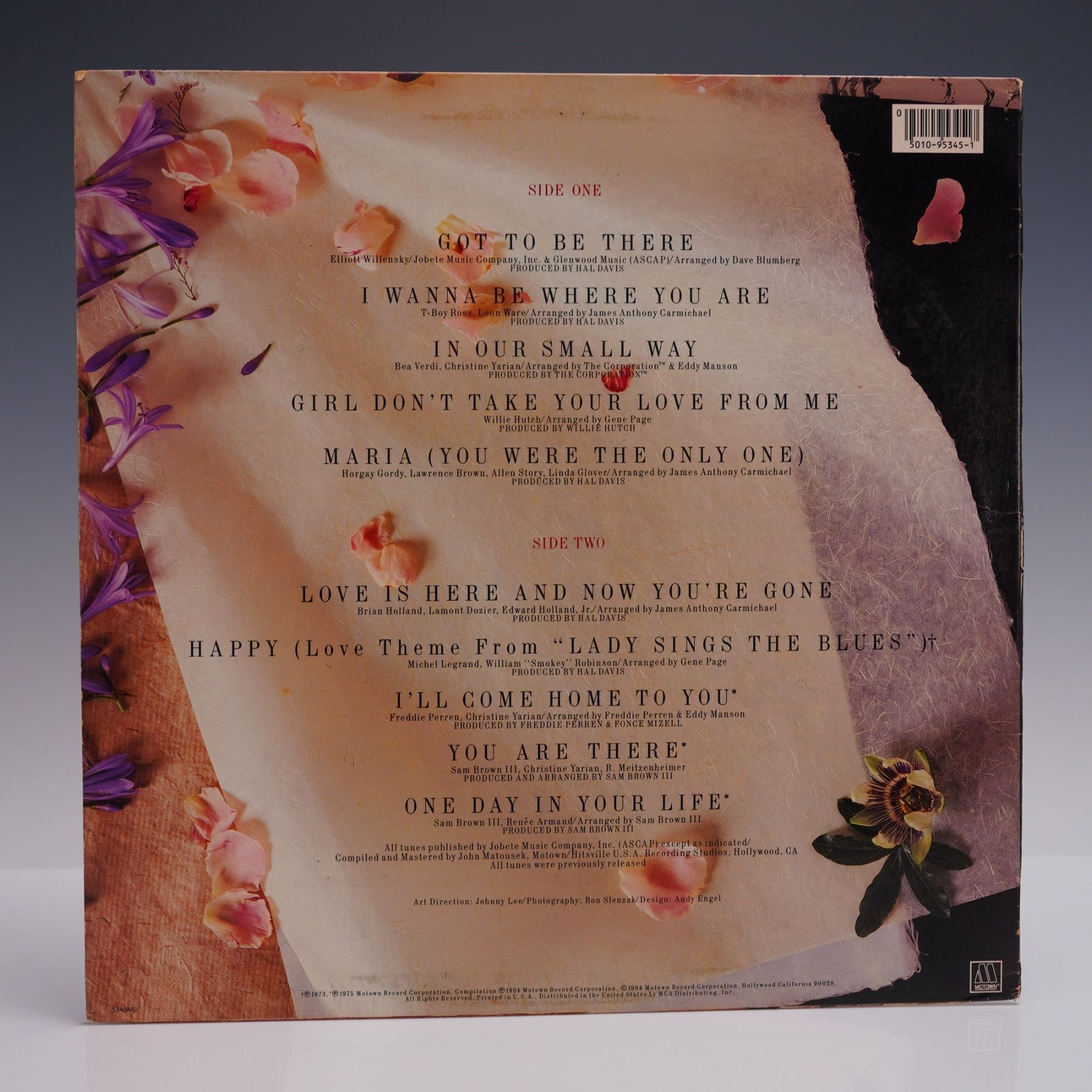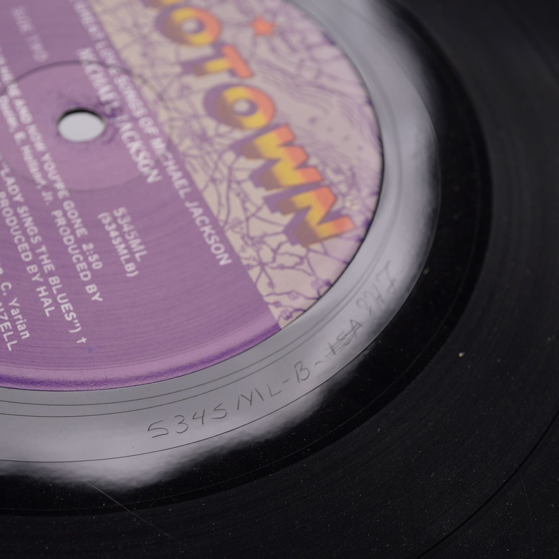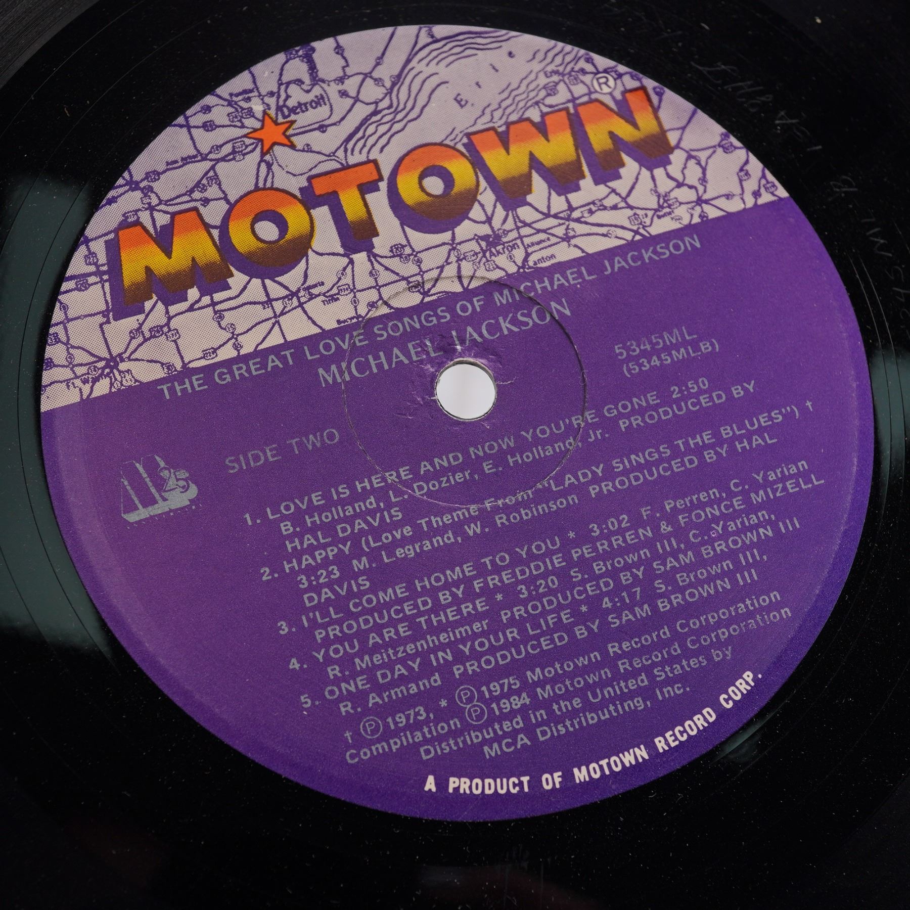1984 Motown Records compilation LP, The Great Love Songs of Michael Jackson. Includes early solo tracks like 'Happy (Love Theme from "Lady Sings the Blues")', 'One Day in Your Life', 'I'll Come Home to You', and 'Got to Be There'. Purple Motown label with Detroit map graphic. Romantic and mellow, this album captures a young MJ in his soulful, pre-Thriller era prime.