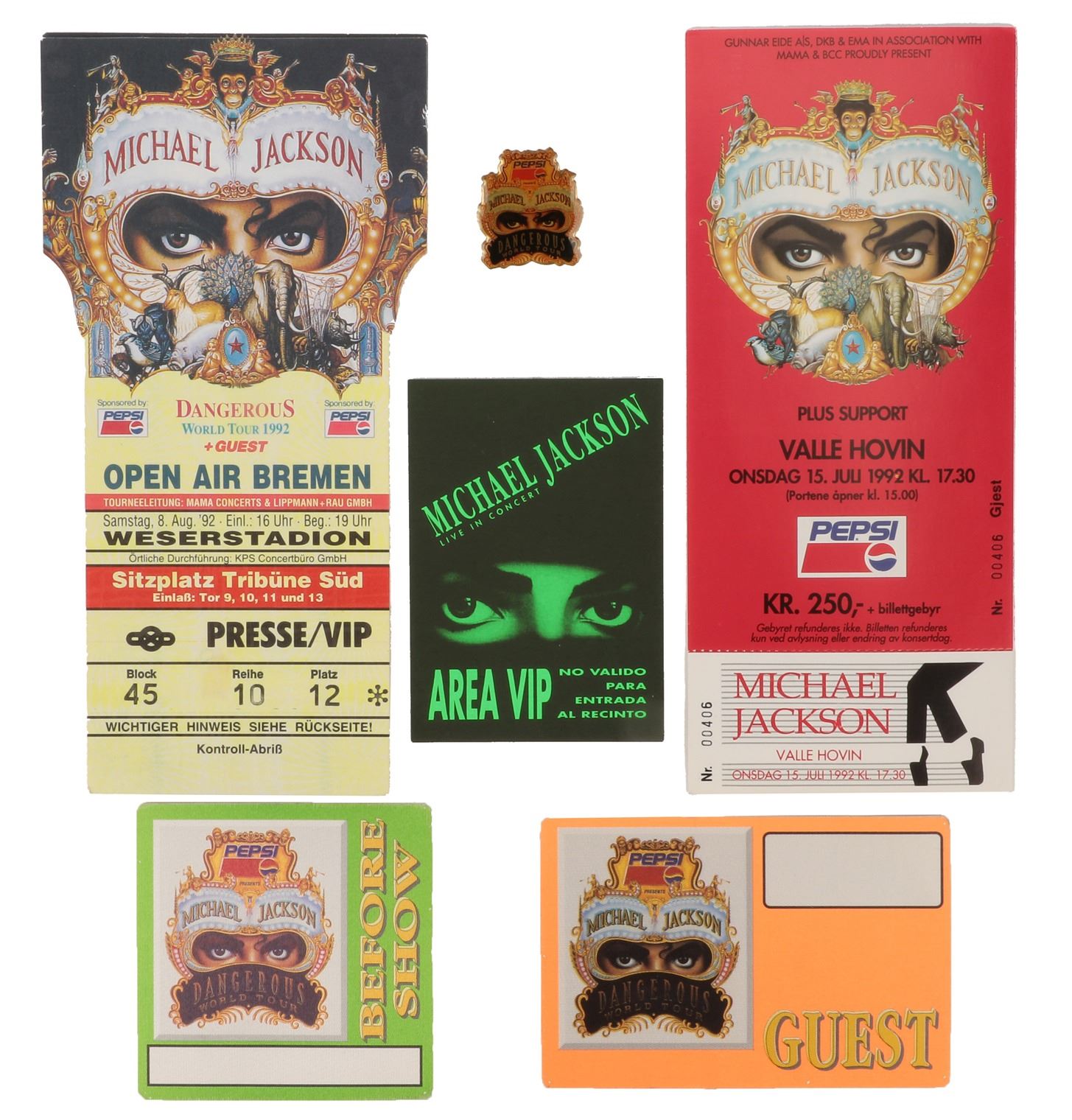 575. Michael Jackson collection of (13) items from the Dangerous World Tour. (1992-1993) Original collection of (13) items including (1) brass pin with printed tour logo under layer of colorless resin measuring approx. 1.2 x 1.4 in., (1) neon green fabric "Before Show" sticker badge measuring 3.25 in., (1) neon orange fabric "Guest" sticker badge measuring 4.5 x 3 in., (4) black and green "Area VIP" stickers measuring 2.75 x 4 in., (2) red "Valle Hovin" tickets measuring 8.25 x 3.5 in., and (4) pale yellow logo tickets measuring 8.2 x 4.15 in., 3-from Bremen, 1-from Hamburg. $200 - $300