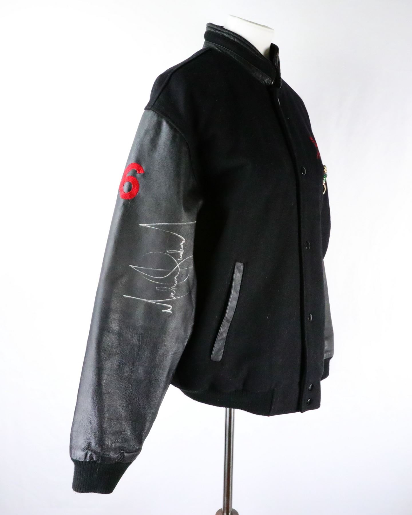 Michael Jackson's Personally Owned Panthers Football Jacket W/Vintage Parrot Brooch Signed in Mumbai, India 1996 W/Letter of Provenance - This black letterman style jacket was personally owned by the King of Pop, Michael Jackson. The black wool jacket with leather sleeves is decorated with red lettering reading "Panthers Football" across the back, the number "36" on the right sleeve and "WR" on the left. The front of the jacket is also decorated with a red embroidered Panthers logo and has a vintage enamel and rhinestone parrot brooch attached directly underneath. The right sleeve is signed "Michael Jackson" and the left is signed "I love you". The jacket will be accompanied by a letter of provenance which states that the jacket was signed by Michael on October 30, 1996 in Mumbai, India at his hotel The Oberoi. Michael was in India to perform on his History World Tour on November 1, 1996. According to the letter, Michael signed the jacket for his butler who was serving him in the hotel and asked him for an autograph that he could give to his daughter. If you would like more information regarding the provenance or authenticity of this piece, please email brigitte@gwsauctions.com.