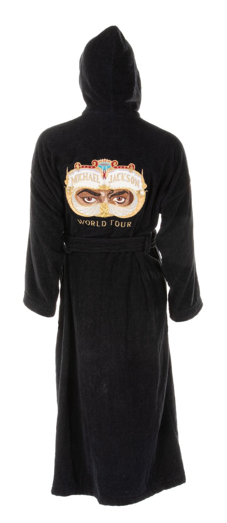 573. Michael Jackson's personal backstage hooded "concealment robe" from his Dangerous World Tour. (1992-1993) Original black terry cloth hooded robe with shawl collar, self belt, and detailed multicolor embroidery "Michael Jackson World Tour" logo with Jackson's eyes and a small fairy holding a crown, reference to his legacy as "King of Pop". Robes like this were given to his dancers to wear after performing in order to allow time for safely cooling down. This is one of only two robes Jackson ever wore, obtained directly from his costumer, Michael Bush, who gifted the rare piece to his assistant, Catherine Marie Highland. Comes with detailed LOA. Exhibiting minor wear and fading. In good to very good condition. $8,000 - $12,000