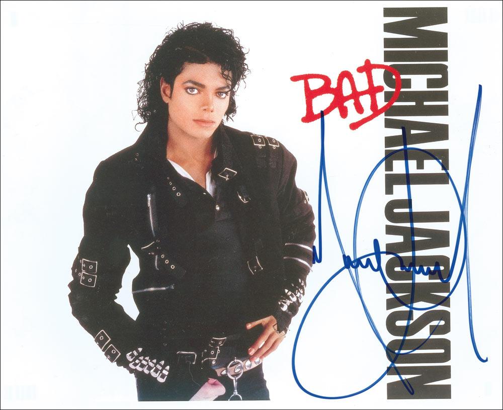 Color glossy 10.25 x 8.5 high quality laser jet printed photo of Jackson as he appeared on the Bad album, signed in blue felt tip. In fine condition.