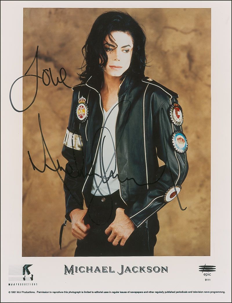 Color glossy 8 x 10 Epic Records publicity photo, signed in black felt tip, “Love, Michael Jackson.” In fine condition, with some light contrast to portion of signature.