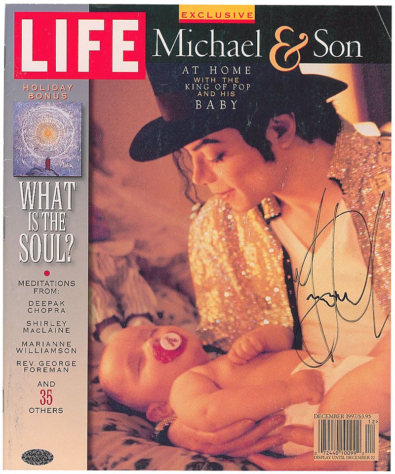 Life magazine, dated December 1997, featuring an image of Jackson holding his newborn son, signed on the front cover in black felt tip. Some scattered light wear to covers and an authentication label affixed to lower left corner, otherwise fine condition.