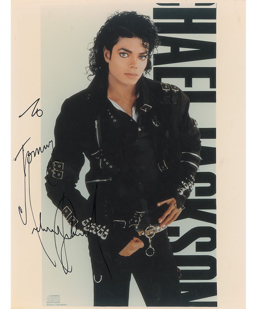 Color glossy 8 x 10 photo of Jackson from the Bad album, signed and inscribed in black felt tip “To Tommy, Michael Jackson.” In fine condition, with a bit of light contrast to the end of signature.