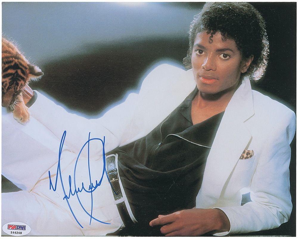 Outstanding color glossy 10 x 8 photo of Jackson from the Thriller album, signed in blue felt tip. In fine condition, with a PSA/DNA label affixed to the lower right corner. Accompanied by a full letter of authenticity from PSA/DNA.